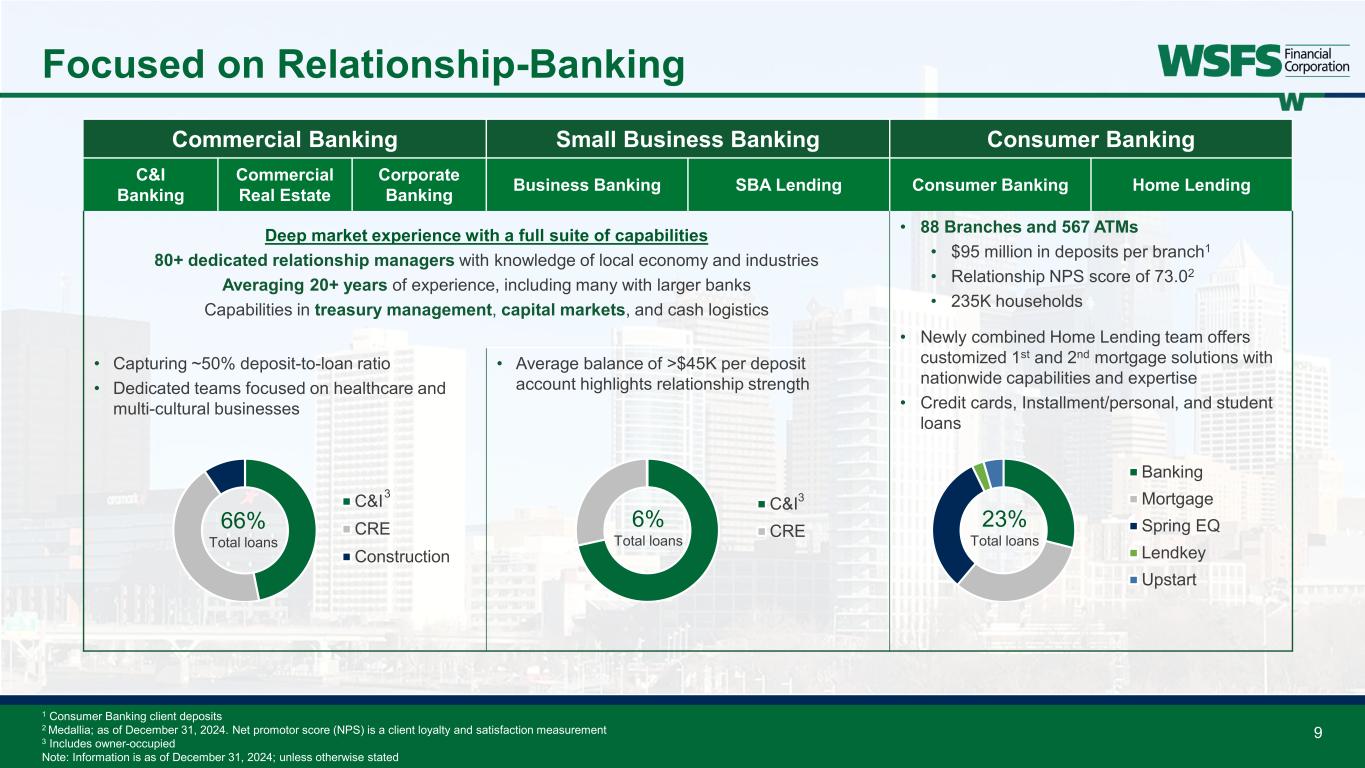 • 88 branches & 567 ATMs • Home Lending & Consumer loans • Built-in referral network • Financial planning • Family office services • Succession and estate planning • Investment management • Charitable/foundation strategies • Trustee and agent services on asset securitizations and debt issuances • Custody/escrow services • Default/bankruptcy trustee • Personal trust • Unique assets • Investment management • Business transactions • Logistics services (bailment, armored carrier, and currency) • Cash services (ATM/smart safes, reconciliation, and forecasting) • C&I, CRE, and Construction lending • Treasury Management • Capital Markets • C&I and CRE lending • SBA lending • Equipment financing • Focus on small ticket leasing Private Wealth Management Institutional Services Bryn Mawr Trust of Delaware Cash Connect® Consumer BankingCommercial Banking Small Business Banking NewLane Finance® 8 Local Knowledge Combined with National Scale 2024 Fees: $63.2 million AUA/AUM1: $11.2 billion 2024 Fees: $26.8 million AUA/AUM1: $50.5 billion 2024 Fees: $58.5 million AUA1: $27.8 billion 2024 Fees: $114.5 million Total Units: 39,141 Relationship-based banking generates high margins, resilient deposits, and fee opportunities 1 AUA represents Assets Under Administration and AUM represents Assets Under Management; AUM includes certain flat-fee assets Note: Information is as of December 31, 2024; unless otherwise stated Significant fee revenue is a key differentiator and serves as a growth engine for the franchise and banking products Loans: $3.1 billion Loans: $8.7 billion Deposits: $4.2 billion Loans: $0.8 billion Deposits: $2.0 billion Leases: $0.6 billion Deposits: $8.3 billion
