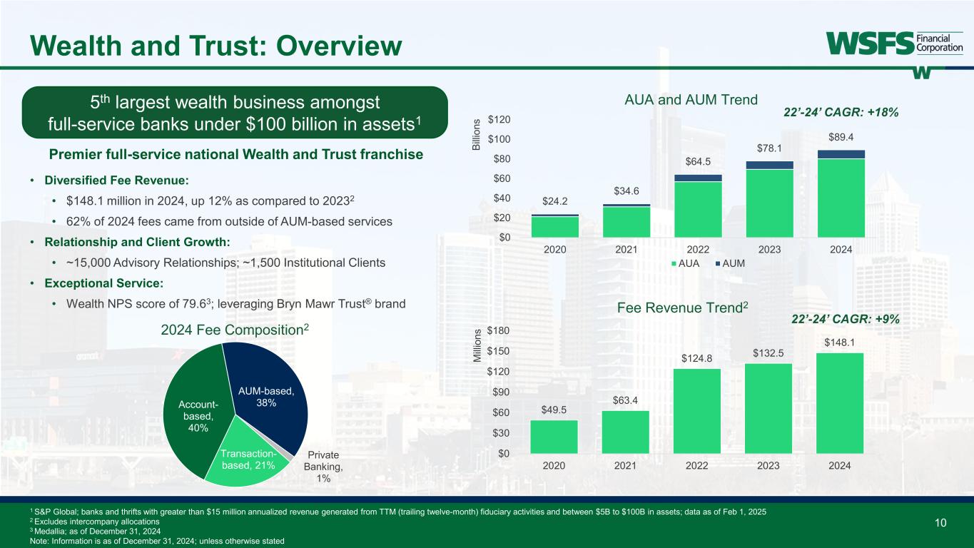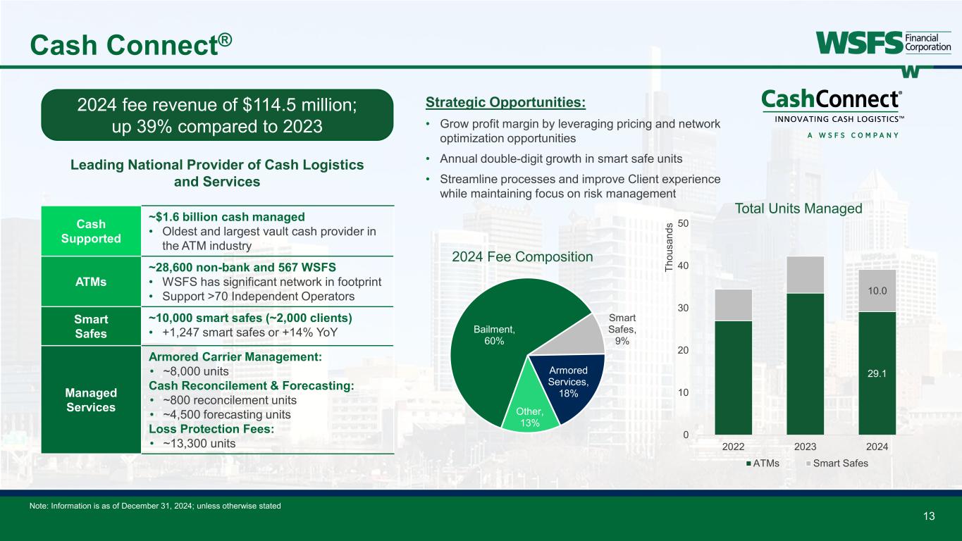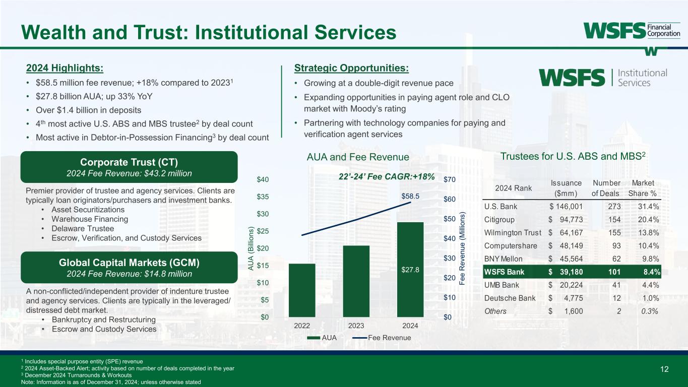 Trustees for U.S. ABS and MBS2 Issuance ($mm) Number of Deals Market Share % U.S. Bank 146,001$ 273 31.4% Citigroup 94,773$ 154 20.4% Wilmington Trust 64,167$ 155 13.8% Computershare 48,149$ 93 10.4% BNY Mellon 45,564$ 62 9.8% WSFS Bank 39,180$ 101 8.4% UMB Bank 20,224$ 41 4.4% Deutsche Bank 4,775$ 12 1.0% Others 1,600$ 2 0.3% 2024 Rank 12 Wealth and Trust: Institutional Services 2024 Highlights: • $58.5 million fee revenue; +18% compared to 20231 • $27.8 billion AUA; up 33% YoY • Over $1.4 billion in deposits • 4th most active U.S. ABS and MBS trustee2 by deal count • Most active in Debtor-in-Possession Financing3 by deal count Global Capital Markets (GCM) 2024 Fee Revenue: $14.8 million A non-conflicted/independent provider of indenture trustee and agency services. Clients are typically in the leveraged/ distressed debt market. • Bankruptcy and Restructuring • Escrow and Custody Services Corporate Trust (CT) 2024 Fee Revenue: $43.2 million Premier provider of trustee and agency services. Clients are typically loan originators/purchasers and investment banks. • Asset Securitizations • Warehouse Financing • Delaware Trustee • Escrow, Verification, and Custody Services Strategic Opportunities: • Growing at a double-digit revenue pace • Expanding opportunities in paying agent role and CLO market with Moody’s rating • Partnering with technology companies for paying and verification agent services $27.8 $58.5 $0 $10 $20 $30 $40 $50 $60 $70 $0 $5 $10 $15 $20 $25 $30 $35 $40 2022 2023 2024 Fe e R ev en ue (M illi on s) AU A (B illi on s) AUA and Fee Revenue AUA Fee Revenue 1 Includes special purpose entity (SPE) revenue 2 2024 Asset-Backed Alert; activity based on number of deals completed in the year 3 December 2024 Turnarounds & Workouts Note: Information is as of December 31, 2024; unless otherwise stated 22’-24’ Fee CAGR:+18%