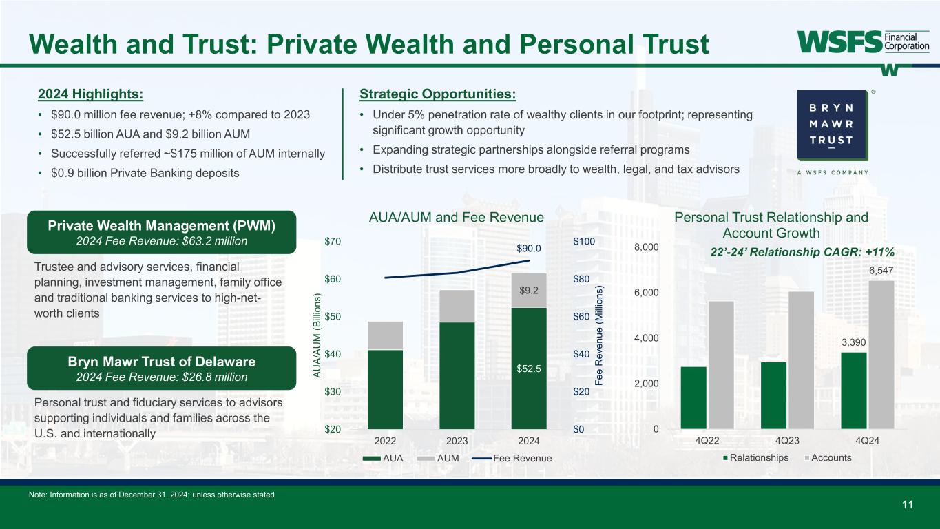 $24.2 $34.6 $64.5 $78.1 $89.4 $0 $20 $40 $60 $80 $100 $120 2020 2021 2022 2023 2024 Bi llio ns AUA AUM AUA and AUM Trend 10 Wealth and Trust: Overview Premier full-service national Wealth and Trust franchise • Diversified Fee Revenue: • $148.1 million in 2024, up 12% as compared to 20232 • 62% of 2024 fees came from outside of AUM-based services • Relationship and Client Growth: • ~15,000 Advisory Relationships; ~1,500 Institutional Clients • Exceptional Service: • Wealth NPS score of 79.63; leveraging Bryn Mawr Trust® brand 5th largest wealth business amongst full-service banks under $100 billion in assets1 1 S&P Global; banks and thrifts with greater than $15 million annualized revenue generated from TTM (trailing twelve-month) fiduciary activities and between $5B to $100B in assets; data as of Feb 1, 2025 2 Excludes intercompany allocations 3 Medallia; as of December 31, 2024 Note: Information is as of December 31, 2024; unless otherwise stated Transaction- based, 21% Account- based, 40% AUM-based, 38% Private Banking, 1% 2024 Fee Composition2 22’-24’ CAGR: +18% $49.5 $63.4 $124.8 $132.5 $148.1 $0 $30 $60 $90 $120 $150 $180 2020 2021 2022 2023 2024 M illi on s Fee Revenue Trend2 22’-24’ CAGR: +9%