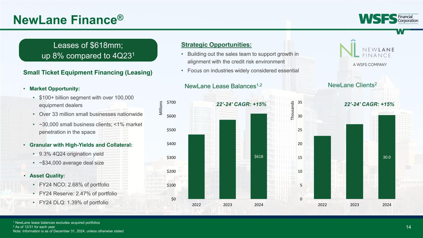 13 Cash Connect® Cash Supported ~$1.6 billion cash managed • Oldest and largest vault cash provider in the ATM industry ATMs ~28,600 non-bank and 567 WSFS • WSFS has significant network in footprint • Support >70 Independent Operators Smart Safes ~10,000 smart safes (~2,000 clients) • +1,247 smart safes or +14% YoY Managed Services Armored Carrier Management: • ~8,000 units Cash Reconcilement & Forecasting: • ~800 reconcilement units • ~4,500 forecasting units Loss Protection Fees: • ~13,300 units 2024 fee revenue of $114.5 million; up 39% compared to 2023 29.1 10.0 0 10 20 30 40 50 2022 2023 2024 Th ou sa nd s Total Units Managed ATMs Smart Safes Leading National Provider of Cash Logistics and Services Bailment, 60% Smart Safes, 9% Armored Services, 18% Other, 13% 2024 Fee Composition Strategic Opportunities: • Grow profit margin by leveraging pricing and network optimization opportunities • Annual double-digit growth in smart safe units • Streamline processes and improve Client experience while maintaining focus on risk management Note: Information is as of December 31, 2024; unless otherwise stated