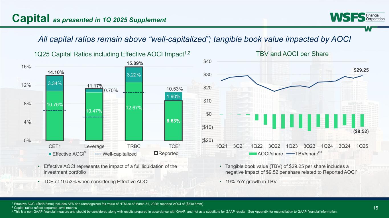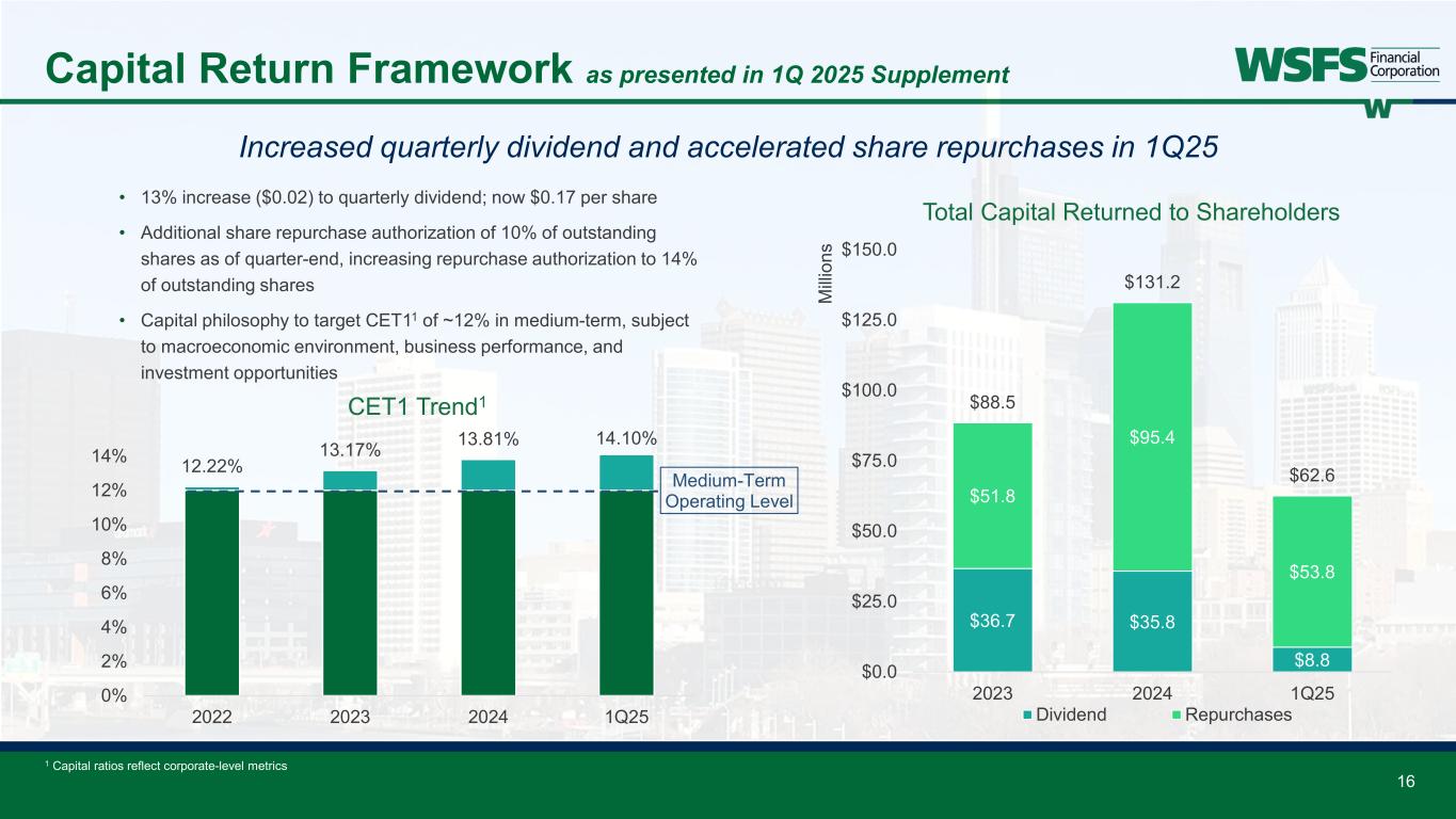 15 Capital as presented in 1Q 2025 Supplement All capital ratios remain above “well-capitalized”; tangible book value impacted by AOCI 1 Effective AOCI ($648.6mm) includes AFS and unrecognized fair value of HTM as of March 31, 2025; reported AOCI of ($549.5mm) 2 Capital ratios reflect corporate-level metrics 3 This is a non-GAAP financial measure and should be considered along with results prepared in accordance with GAAP, and not as a substitute for GAAP results. See Appendix for reconciliation to GAAP financial information. 10.76% 10.47% 12.67% 8.63% 3.34% 0.70% 3.22% 1.90% 14.10% 11.17% 15.89% 10.53% 0% 4% 8% 12% 16% CET1 Leverage TRBC TCE Effective AOCI Well-capitalized Reported 1Q25 Capital Ratios including Effective AOCI Impact1,2 • Effective AOCI represents the impact of a full liquidation of the investment portfolio • TCE of 10.53% when considering Effective AOCI ($9.52) $29.25 ($20) ($10) $0 $10 $20 $30 $40 1Q21 3Q21 1Q22 3Q22 1Q23 3Q23 1Q24 3Q24 1Q25 TBV and AOCI per Share AOCI/share TBV/share • Tangible book value (TBV) of $29.25 per share includes a negative impact of $9.52 per share related to Reported AOCI1 • 19% YoY growth in TBV 3 2,33