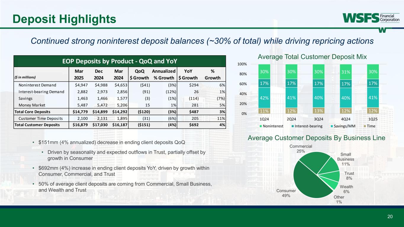 19 Loan Portfolio Highlights Commercial loans flat due to economic uncertainty and muted originations 1 Includes new loans, existing new funding, paydowns, payoffs, and prior Commercial runoff portfolios. Excludes reclasses, HFS, purchase accounting mark/unearned changes, and Commercial leases 2 C&I loans includes owner-occupied real estate • Commercial: Loans flat QoQ with lower originations as Clients postponed major investments due to the uncertain economic conditions • Line utilization of 38.1%, up from 36.5% last quarter mainly due to seasonality trends • 90-day weighted average pipeline remains stable at approximately $240mm • Consumer: $66mm of continued runoff in the partnership portfolios, consistent with prior quarter; $15mm of growth within WSFS-originated loans $326 $364 $353 $330 $230 ($241) ($285) ($254) ($441) ($278) $(600) $(400) $(200) - $200 $400 $600 1Q24 2Q24 3Q24 4Q24 1Q25 New Loans Fundings Paydown/Payoffs Commercial Portfolio: New Net Loan Fundings ($mm)1 ($ in millions) Mar 2025 Dec 2024 Mar 2024 QoQ $ Growth Annualized % Growth YoY $ Growth % Growth C & I Loans2 $4,651 $4,652 $4,489 ($1) (0%) $162 4% Commercial Mortgages (CRE) 3,982 4,031 3,877 (49) (5%) 105 3% Construction Loans 869 832 1,056 37 18% (187) (18%) Commercial Leases 636 648 634 (12) (8%) 2 0% Total Commercial Loans $10,138 $10,163 $10,056 ($25) (1%) $82 1% Residential Mortgage (HFS/HFI) 992 992 888 0 0% 104 12% Consumer Loans 2,033 2,086 2,066 (53) (10%) (33) (2%) Total Gross Loans $13,163 $13,241 $13,010 ($78) (2%) $153 1% EOP Loans - QoQ and YoY