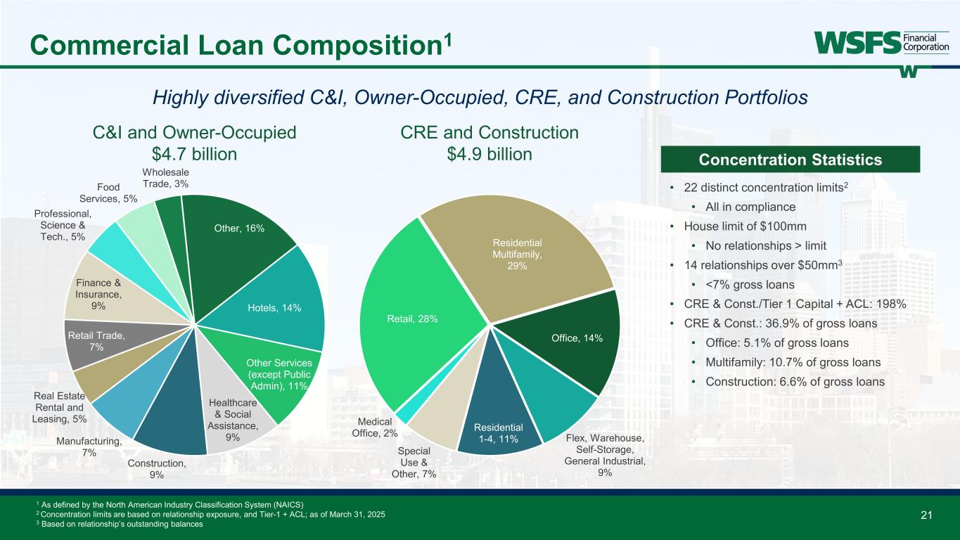 20 Deposit Highlights Continued strong noninterest deposit balances (~30% of total) while driving repricing actions • $151mm (4% annualized) decrease in ending client deposits QoQ • Driven by seasonality and expected outflows in Trust, partially offset by growth in Consumer • $692mm (4%) increase in ending client deposits YoY, driven by growth within Consumer, Commercial, and Trust • 50% of average client deposits are coming from Commercial, Small Business, and Wealth and Trust Consumer 49% Commercial 25% Small Business 11% Trust 8% Wealth 6% Other 1% Average Customer Deposits By Business Line 11% 12% 13% 12% 12% 42% 41% 40% 40% 41% 17% 17% 17% 17% 17% 30% 30% 30% 31% 30% 0% 20% 40% 60% 80% 100% 1Q24 2Q24 3Q24 4Q24 1Q25 Noninterest Interest-bearing Savings/MM Time Average Total Customer Deposit Mix ($ in millions) Mar 2025 Dec 2024 Mar 2024 QoQ $ Growth Annualized % Growth YoY $ Growth % Growth Noninterest Demand $4,947 $4,988 $4,653 ($41) (3%) $294 6% Interest-bearing Demand 2,882 2,973 2,856 (91) (12%) 26 1% Savings 1,463 1,466 1,577 (3) (1%) (114) (7%) Money Market 5,487 5,472 5,206 15 1% 281 5% Total Core Deposits $14,779 $14,899 $14,292 ($120) (3%) $487 3% Customer Time Deposits 2,100 2,131 1,895 (31) (6%) 205 11% Total Customer Deposits $16,879 $17,030 $16,187 ($151) (4%) $692 4% EOP Deposits by Product - QoQ and YoY