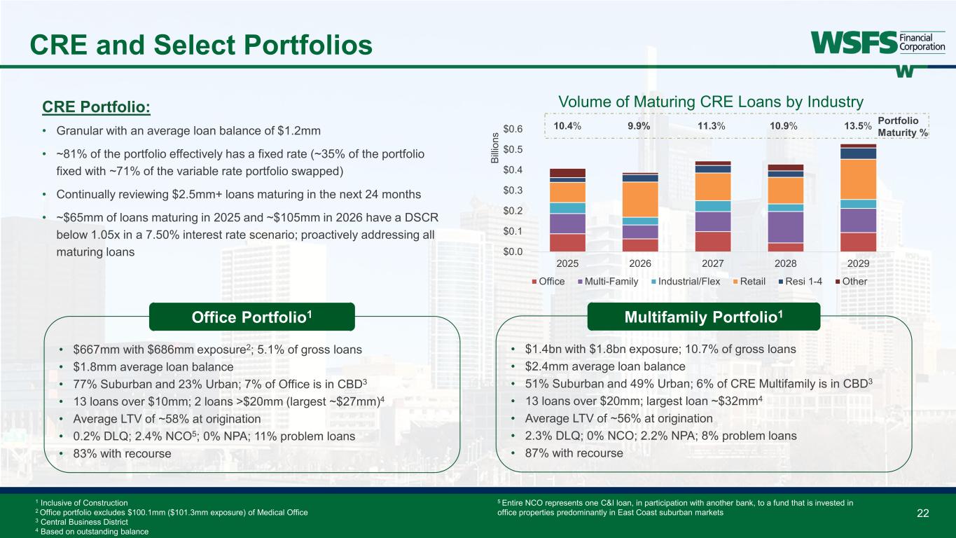 21 Commercial Loan Composition1 Highly diversified C&I, Owner-Occupied, CRE, and Construction Portfolios 1 As defined by the North American Industry Classification System (NAICS) 2 Concentration limits are based on relationship exposure, and Tier-1 + ACL; as of March 31, 2025 3 Based on relationship’s outstanding balances C&I and Owner-Occupied $4.7 billion CRE and Construction $4.9 billion Hotels, 14% Other Services (except Public Admin), 11% Healthcare & Social Assistance, 9% Construction, 9% Manufacturing, 7% Real Estate Rental and Leasing, 5% Retail Trade, 7% Finance & Insurance, 9% Professional, Science & Tech., 5% Food Services, 5% Wholesale Trade, 3% Other, 16% Retail, 28% Residential Multifamily, 29% Office, 14% Flex, Warehouse, Self-Storage, General Industrial, 9% Residential 1-4, 11% Special Use & Other, 7% Medical Office, 2% • 22 distinct concentration limits2 • All in compliance • House limit of $100mm • No relationships > limit • 14 relationships over $50mm3 • <7% gross loans • CRE & Const./Tier 1 Capital + ACL: 198% • CRE & Const.: 36.9% of gross loans • Office: 5.1% of gross loans • Multifamily: 10.7% of gross loans • Construction: 6.6% of gross loans Concentration Statistics