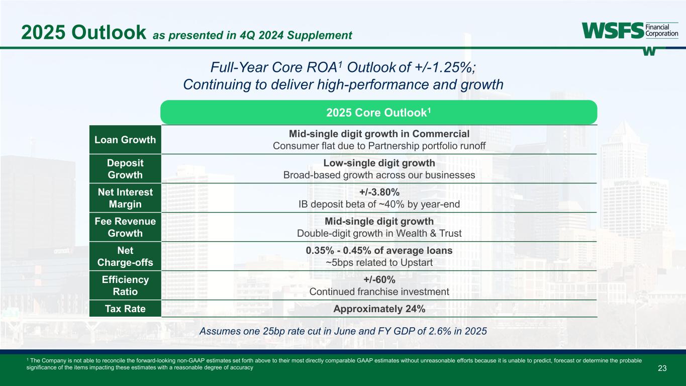 23 2025 Outlook as presented in 4Q 2024 Supplement 1 The Company is not able to reconcile the forward-looking non-GAAP estimates set forth above to their most directly comparable GAAP estimates without unreasonable efforts because it is unable to predict, forecast or determine the probable significance of the items impacting these estimates with a reasonable degree of accuracy Full-Year Core ROA1 Outlook of +/-1.25%; Continuing to deliver high-performance and growth Loan Growth Mid-single digit growth in Commercial Consumer flat due to Partnership portfolio runoff Deposit Growth Low-single digit growth Broad-based growth across our businesses Net Interest Margin +/-3.80% IB deposit beta of ~40% by year-end Fee Revenue Growth Mid-single digit growth Double-digit growth in Wealth & Trust Net Charge-offs 0.35% - 0.45% of average loans ~5bps related to Upstart Efficiency Ratio +/-60% Continued franchise investment Tax Rate Approximately 24% 2025 Core Outlook1 Assumes one 25bp rate cut in June and FY GDP of 2.6% in 2025