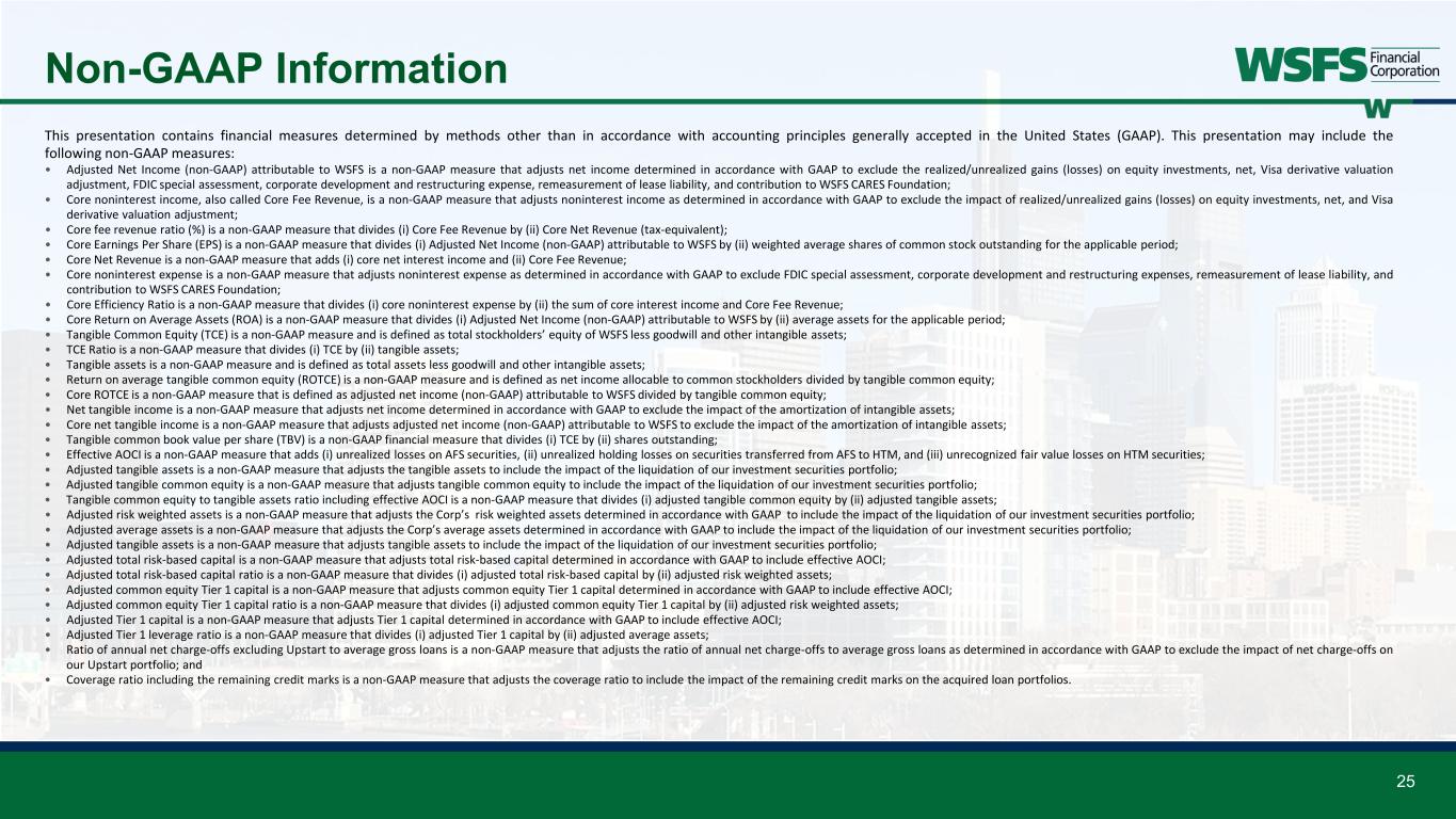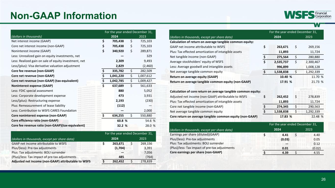 25 Non-GAAP Information This presentation contains financial measures determined by methods other than in accordance with accounting principles generally accepted in the United States (GAAP). This presentation may include the following non-GAAP measures: • Adjusted Net Income (non-GAAP) attributable to WSFS is a non-GAAP measure that adjusts net income determined in accordance with GAAP to exclude the realized/unrealized gains (losses) on equity investments, net, Visa derivative valuation adjustment, FDIC special assessment, corporate development and restructuring expense, remeasurement of lease liability, and contribution to WSFS CARES Foundation; • Core noninterest income, also called Core Fee Revenue, is a non-GAAP measure that adjusts noninterest income as determined in accordance with GAAP to exclude the impact of realized/unrealized gains (losses) on equity investments, net, and Visa derivative valuation adjustment; • Core fee revenue ratio (%) is a non-GAAP measure that divides (i) Core Fee Revenue by (ii) Core Net Revenue (tax-equivalent); • Core Earnings Per Share (EPS) is a non-GAAP measure that divides (i) Adjusted Net Income (non-GAAP) attributable to WSFS by (ii) weighted average shares of common stock outstanding for the applicable period; • Core Net Revenue is a non-GAAP measure that adds (i) core net interest income and (ii) Core Fee Revenue; • Core noninterest expense is a non-GAAP measure that adjusts noninterest expense as determined in accordance with GAAP to exclude FDIC special assessment, corporate development and restructuring expenses, remeasurement of lease liability, and contribution to WSFS CARES Foundation; • Core Efficiency Ratio is a non-GAAP measure that divides (i) core noninterest expense by (ii) the sum of core interest income and Core Fee Revenue; • Core Return on Average Assets (ROA) is a non-GAAP measure that divides (i) Adjusted Net Income (non-GAAP) attributable to WSFS by (ii) average assets for the applicable period; • Tangible Common Equity (TCE) is a non-GAAP measure and is defined as total stockholders’ equity of WSFS less goodwill and other intangible assets; • TCE Ratio is a non-GAAP measure that divides (i) TCE by (ii) tangible assets; • Tangible assets is a non-GAAP measure and is defined as total assets less goodwill and other intangible assets; • Return on average tangible common equity (ROTCE) is a non-GAAP measure and is defined as net income allocable to common stockholders divided by tangible common equity; • Core ROTCE is a non-GAAP measure that is defined as adjusted net income (non-GAAP) attributable to WSFS divided by tangible common equity; • Net tangible income is a non-GAAP measure that adjusts net income determined in accordance with GAAP to exclude the impact of the amortization of intangible assets; • Core net tangible income is a non-GAAP measure that adjusts adjusted net income (non-GAAP) attributable to WSFS to exclude the impact of the amortization of intangible assets; • Tangible common book value per share (TBV) is a non-GAAP financial measure that divides (i) TCE by (ii) shares outstanding; • Effective AOCI is a non-GAAP measure that adds (i) unrealized losses on AFS securities, (ii) unrealized holding losses on securities transferred from AFS to HTM, and (iii) unrecognized fair value losses on HTM securities; • Adjusted tangible assets is a non-GAAP measure that adjusts the tangible assets to include the impact of the liquidation of our investment securities portfolio; • Adjusted tangible common equity is a non-GAAP measure that adjusts tangible common equity to include the impact of the liquidation of our investment securities portfolio; • Tangible common equity to tangible assets ratio including effective AOCI is a non-GAAP measure that divides (i) adjusted tangible common equity by (ii) adjusted tangible assets; • Adjusted risk weighted assets is a non-GAAP measure that adjusts the Corp’s risk weighted assets determined in accordance with GAAP to include the impact of the liquidation of our investment securities portfolio; • Adjusted average assets is a non-GAAP measure that adjusts the Corp’s average assets determined in accordance with GAAP to include the impact of the liquidation of our investment securities portfolio; • Adjusted tangible assets is a non-GAAP measure that adjusts tangible assets to include the impact of the liquidation of our investment securities portfolio; • Adjusted total risk-based capital is a non-GAAP measure that adjusts total risk-based capital determined in accordance with GAAP to include effective AOCI; • Adjusted total risk-based capital ratio is a non-GAAP measure that divides (i) adjusted total risk-based capital by (ii) adjusted risk weighted assets; • Adjusted common equity Tier 1 capital is a non-GAAP measure that adjusts common equity Tier 1 capital determined in accordance with GAAP to include effective AOCI; • Adjusted common equity Tier 1 capital ratio is a non-GAAP measure that divides (i) adjusted common equity Tier 1 capital by (ii) adjusted risk weighted assets; • Adjusted Tier 1 capital is a non-GAAP measure that adjusts Tier 1 capital determined in accordance with GAAP to include effective AOCI; • Adjusted Tier 1 leverage ratio is a non-GAAP measure that divides (i) adjusted Tier 1 capital by (ii) adjusted average assets; • Ratio of annual net charge-offs excluding Upstart to average gross loans is a non-GAAP measure that adjusts the ratio of annual net charge-offs to average gross loans as determined in accordance with GAAP to exclude the impact of net charge-offs on our Upstart portfolio; and • Coverage ratio including the remaining credit marks is a non-GAAP measure that adjusts the coverage ratio to include the impact of the remaining credit marks on the acquired loan portfolios.