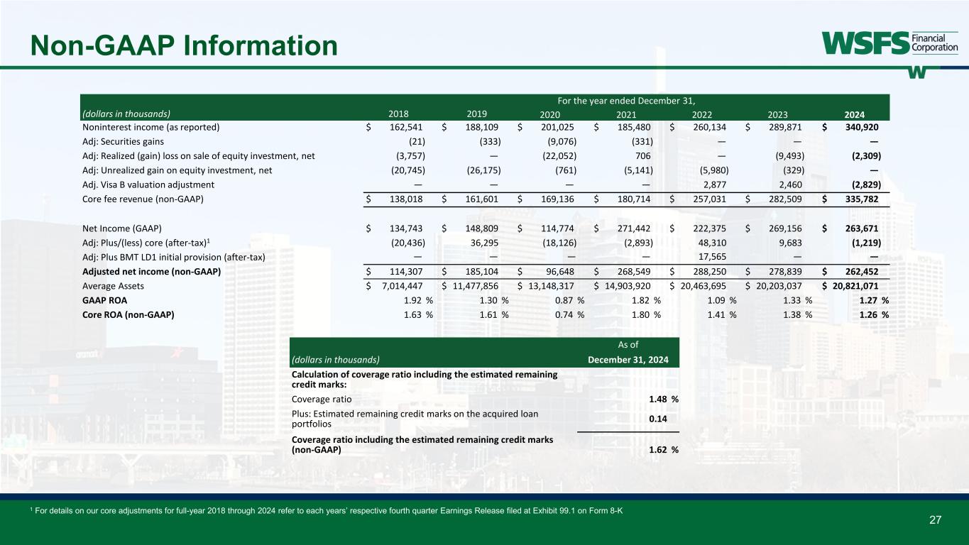 26 Non-GAAP Information For the year ended December 31, (dollars in thousands) 2024 2023 Net interest income (GAAP) $ 705,438 $ 725,103 Core net interest income (non-GAAP) $ 705,438 $ 725,103 Noninterest income (GAAP) $ 340,920 $ 289,871 Less: Unrealized gain on equity investments, net — 329 Less: Realized gain on sale of equity investment, net 2,309 9,493 Less/(plus): Visa derivative valuation adjustment 2,829 (2,460) Core fee revenue (non-GAAP) $ 335,782 $ 282,509 Core net revenue (non-GAAP) $ 1,041,220 $ 1,007,612 Core net revenue (non-GAAP) (tax-equivalent) $ 1,042,785 $ 1,009,427 Noninterest expense (GAAP) $ 637,689 $ 561,633 Less: FDIC special assessment 880 5,052 Less: Corporate development expense 473 3,931 Less/(plus): Restructuring expense 2,193 (230) Plus: Remeasurement of lease liability (112) — Less: Contribution to WSFS CARES Foundation — 2,000 Core noninterest expense (non-GAAP) $ 634,255 $ 550,880 Core efficiency ratio (non-GAAP) 60.8 % 54.6 % Core fee revenue ratio (non-GAAP)(tax-equivalent) 32.2 % 28.0 % For the year ended December 31, (dollars in thousands, except per share data) 2024 2023 GAAP net income attributable to WSFS $ 263,671 $ 269,156 Plus/(less): Pre-tax adjustments (1,704) 3,391 Plus: Tax adjustments: BOLI surrender — 7,056 (Plus)/less: Tax impact of pre-tax adjustments 485 (764) Adjusted net income (non-GAAP) attributable to WSFS $ 262,452 $ 278,839 For the year ended December 31, (dollars in thousands, except per share data) 2024 2023 Calculation of return on average tangible common equity:​ GAAP net income attributable to WSFS​ $ 263,671 $ 269,156 Plus: Tax effected amortization of intangible assets​ 11,893 11,724 Net tangible income (non-GAAP)​ $ 275,564 $ 280,880 Average stockholders' equity of WSFS​ $ 2,535,737 $ 2,300,467 Less: Average goodwill and intangible assets​ 996,899 1,008,128 Net average tangible common equity​ $ 1,538,838 $ 1,292,339 Return on average equity (GAAP)​ 10.40 % 11.70 % Return on average tangible common equity (non-GAAP)​ 17.91 % 21.73 % Calculation of core return on average tangible common equity:​ Adjusted net income (non-GAAP) attributable to WSFS​ $ 262,452 $ 278,839 Plus: Tax effected amortization of intangible assets​ 11,893 11,724 Core net tangible income (non-GAAP)​ $ 274,345 $ 290,563 Net average tangible common equity​ $ 1,538,838 $ 1,292,339 Core return on average tangible common equity (non-GAAP)​ 17.83 % 22.48 % For the year ended December 31, (dollars in thousands, except per share data) 2024 2023 Earnings per share (diluted)(GAAP) $ 4.41 $ 4.40 Plus/(less): Pre-tax adjustments (0.03) 0.05 Plus: Tax adjustments: BOLI surrender — 0.12 (Plus)/less: Tax impact of pre-tax adjustments 0.01 (0.02) Core earnings per share (non-GAAP) $ 4.39 $ 4.55