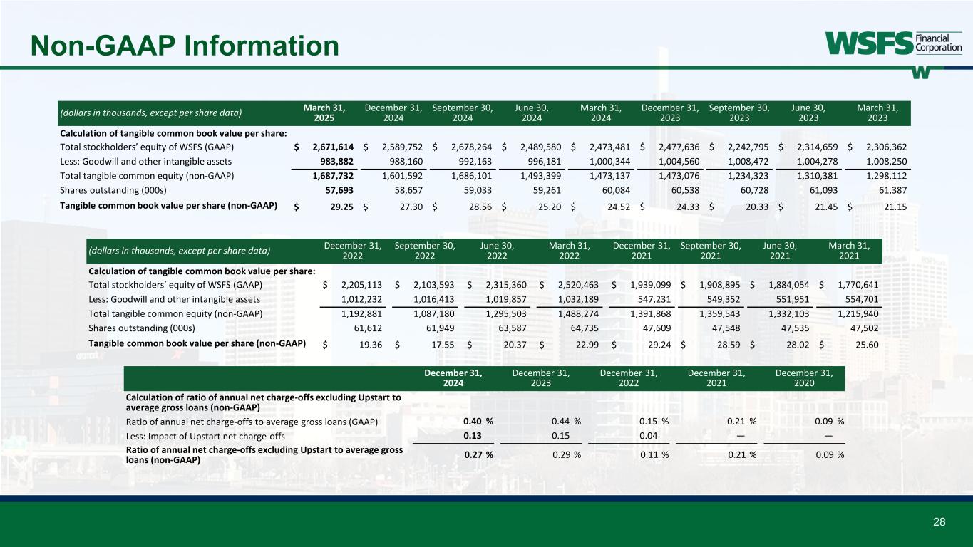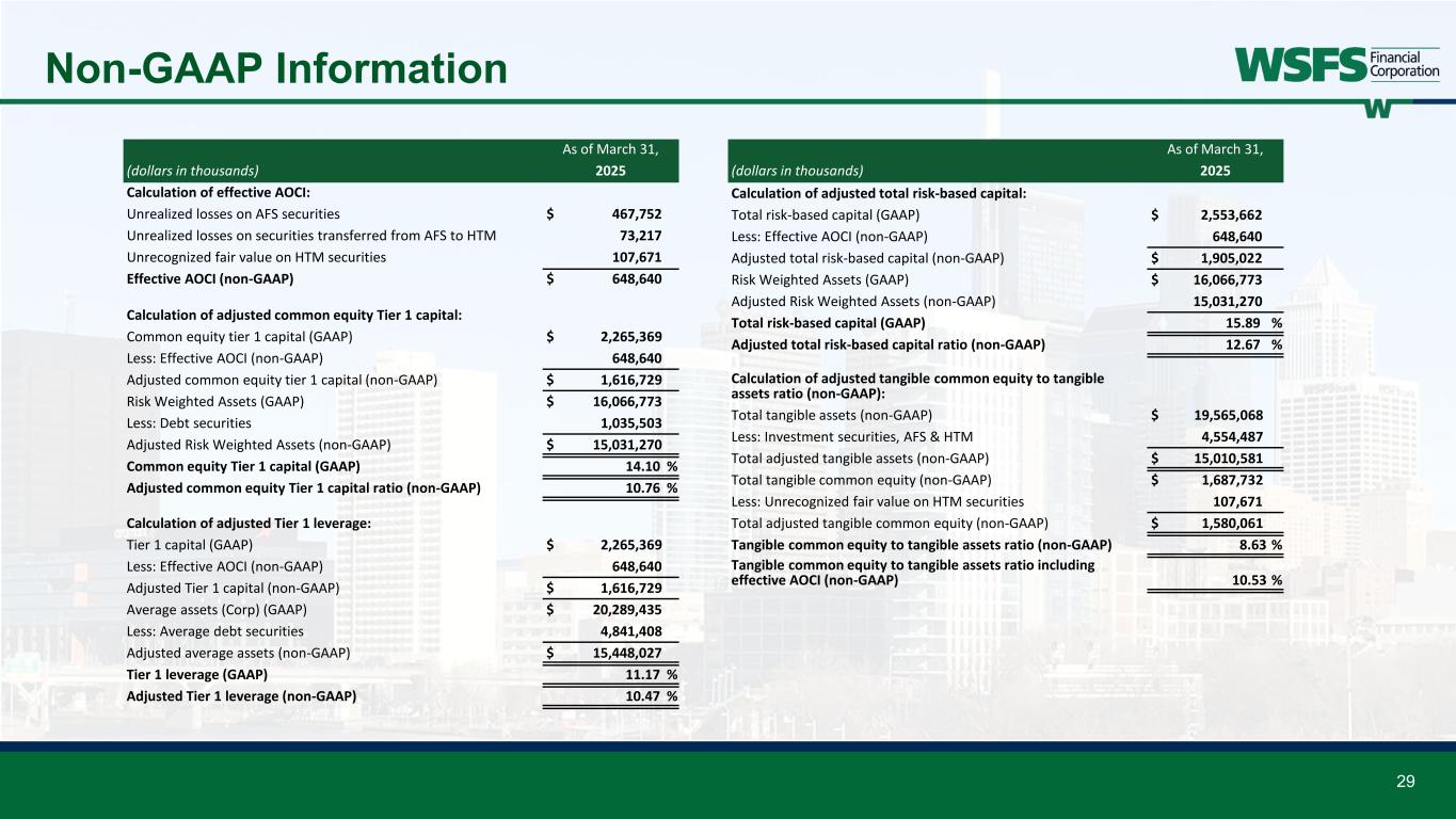 28 Non-GAAP Information (dollars in thousands, except per share data) March 31, 2025 December 31, 2024 September 30, 2024 June 30, 2024 March 31, 2024 December 31, 2023 September 30, 2023 June 30, 2023 March 31, 2023 Calculation of tangible common book value per share: Total stockholders’ equity of WSFS (GAAP) $ 2,671,614 $ 2,589,752 $ 2,678,264 $ 2,489,580 $ 2,473,481 $ 2,477,636 $ 2,242,795 $ 2,314,659 $ 2,306,362 Less: Goodwill and other intangible assets 983,882 988,160 992,163 996,181 1,000,344 1,004,560 1,008,472 1,004,278 1,008,250 Total tangible common equity (non-GAAP) 1,687,732 1,601,592 1,686,101 1,493,399 1,473,137 1,473,076 1,234,323 1,310,381 1,298,112 Shares outstanding (000s) 57,693 58,657 59,033 59,261 60,084 60,538 60,728 61,093 61,387 Tangible common book value per share (non-GAAP) $ 29.25 $ 27.30 $ 28.56 $ 25.20 $ 24.52 $ 24.33 $ 20.33 $ 21.45 $ 21.15 (dollars in thousands, except per share data) December 31, 2022 September 30, 2022 June 30, 2022 March 31, 2022 December 31, 2021 September 30, 2021 June 30, 2021 March 31, 2021 Calculation of tangible common book value per share: Total stockholders’ equity of WSFS (GAAP) $ 2,205,113 $ 2,103,593 $ 2,315,360 $ 2,520,463 $ 1,939,099 $ 1,908,895 $ 1,884,054 $ 1,770,641 Less: Goodwill and other intangible assets 1,012,232 1,016,413 1,019,857 1,032,189 547,231 549,352 551,951 554,701 Total tangible common equity (non-GAAP) 1,192,881 1,087,180 1,295,503 1,488,274 1,391,868 1,359,543 1,332,103 1,215,940 Shares outstanding (000s) 61,612 61,949 63,587 64,735 47,609 47,548 47,535 47,502 Tangible common book value per share (non-GAAP) $ 19.36 $ 17.55 $ 20.37 $ 22.99 $ 29.24 $ 28.59 $ 28.02 $ 25.60 December 31, 2024 December 31, 2023 December 31, 2022 December 31, 2021 December 31, 2020 Calculation of ratio of annual net charge-offs excluding Upstart to average gross loans (non-GAAP) Ratio of annual net charge-offs to average gross loans (GAAP) 0.40 % 0.44 % 0.15 % 0.21 % 0.09 % Less: Impact of Upstart net charge-offs 0.13 0.15 0.04 — — Ratio of annual net charge-offs excluding Upstart to average gross loans (non-GAAP) 0.27 % 0.29 % 0.11 % 0.21 % 0.09 %
