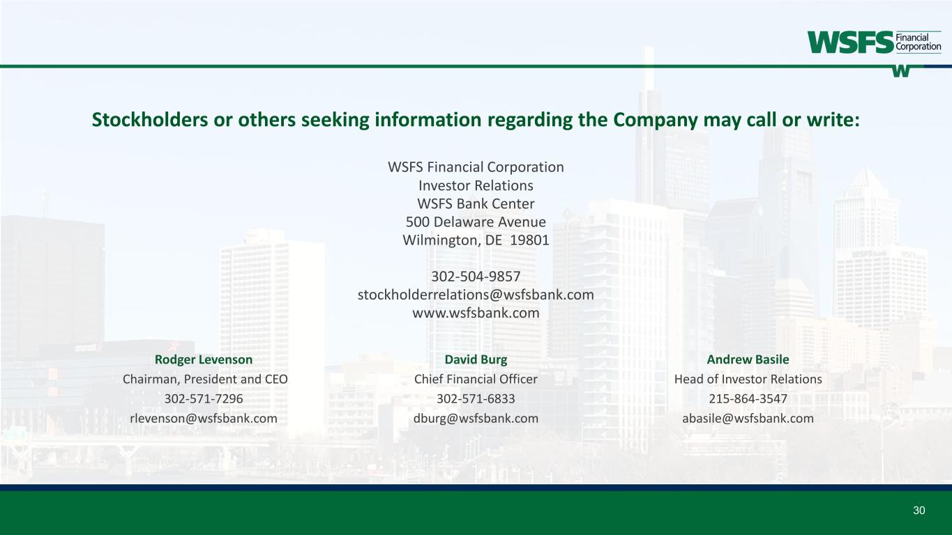 30 Stockholders or others seeking information regarding the Company may call or write: WSFS Financial Corporation Investor Relations WSFS Bank Center 500 Delaware Avenue Wilmington, DE 19801 302-504-9857 stockholderrelations@wsfsbank.com www.wsfsbank.com Rodger Levenson Chairman, President and CEO 302-571-7296 rlevenson@wsfsbank.com David Burg Chief Financial Officer 302-571-6833 dburg@wsfsbank.com Andrew Basile Head of Investor Relations 215-864-3547 abasile@wsfsbank.com