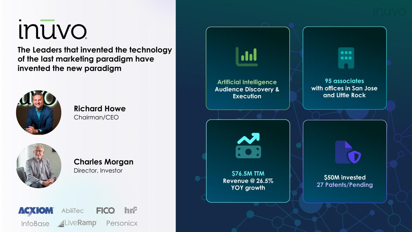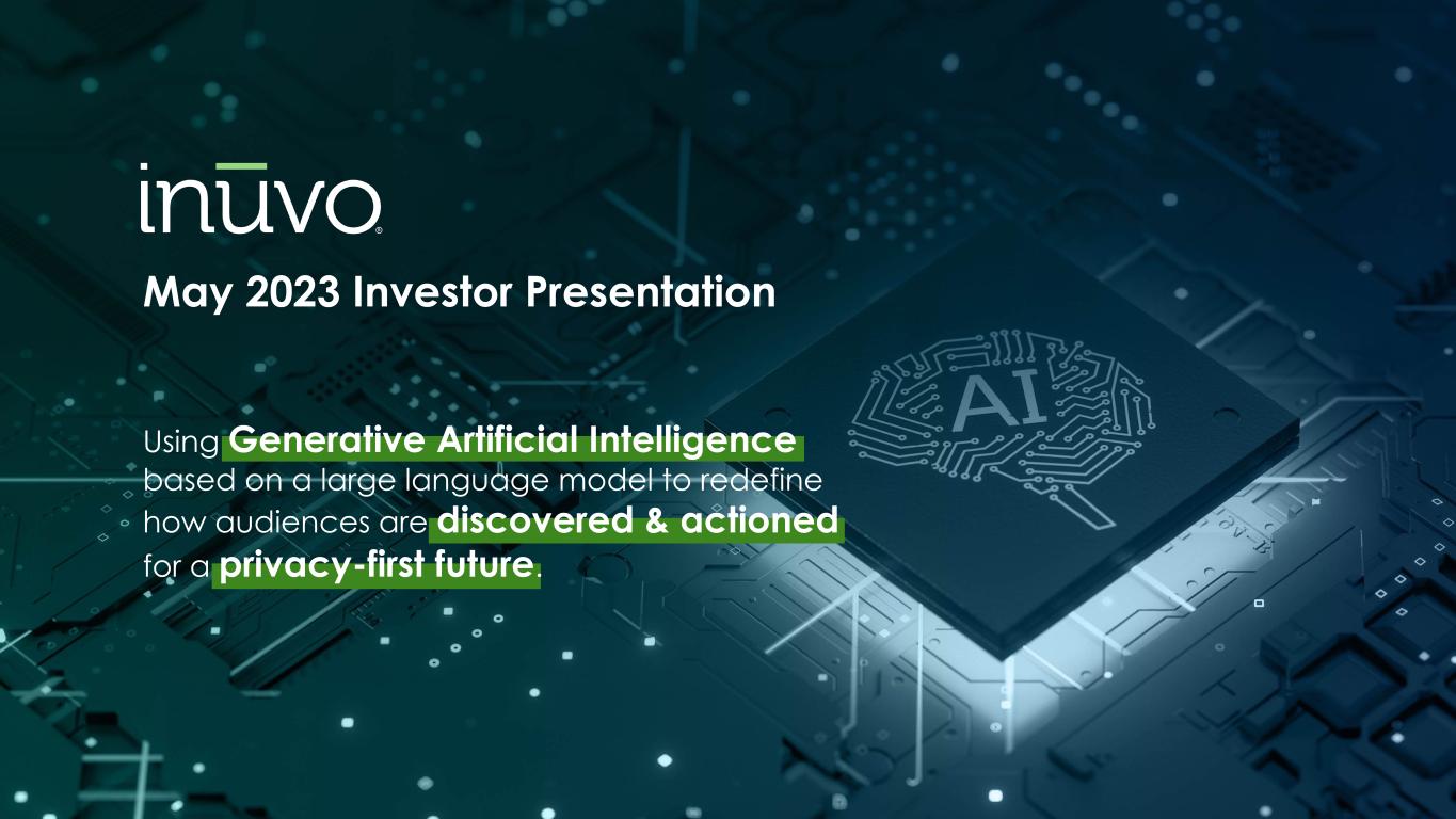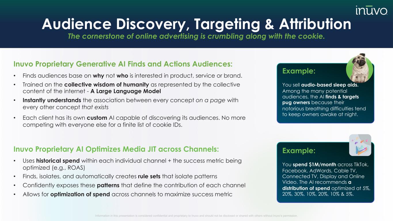 Information in this presentation is considered confidential and proprietary to Inuvo and should not be disclosed or shared with others without Inuvo’s permission. Inuvo Proprietary AI Optimizes Media JIT across Channels: • Uses historical spend within each individual channel + the success metric being optimized (e.g., ROAS) • Finds, isolates, and automatically creates rule sets that isolate patterns • Confidently exposes these patterns that define the contribution of each channel • Allows for optimization of spend across channels to maximize success metric Example: You spend $1M/month across TikTok, Facebook, AdWords, Cable TV, Connected TV, Display and Online Video. The AI recommends a distribution of spend optimized at 5%, 20%, 30%, 10%, 20%, 10% & 5%. Audience Discovery, Targeting & Attribution The cornerstone of online advertising is crumbling along with the cookie. Example: You sell audio-based sleep aids. Among the many potential audiences, the AI finds & targets pug owners because their notorious breathing difficulties tend to keep owners awake at night. Inuvo Proprietary Generative AI Finds and Actions Audiences: • Finds audiences base on why not who is interested in product, service or brand. • Trained on the collective wisdom of humanity as represented by the collective content of the internet - A Large Language Model • Instantly understands the association between every concept on a page with every other concept that exists • Each client has its own custom AI capable of discovering its audiences. No more competing with everyone else for a finite list of cookie IDs.
