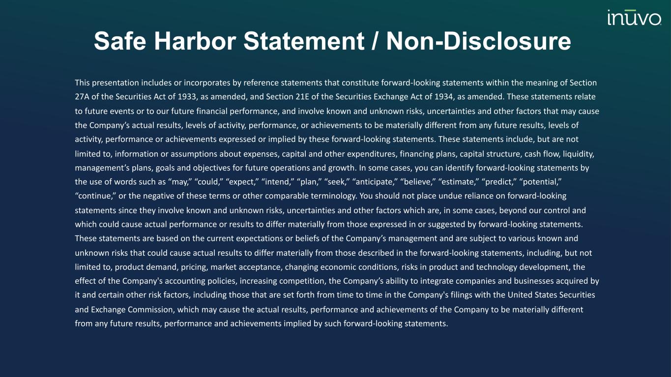 Safe Harbor Statement / Non-Disclosure This presentation includes or incorporates by reference statements that constitute forward-looking statements within the meaning of Section 27A of the Securities Act of 1933, as amended, and Section 21E of the Securities Exchange Act of 1934, as amended. These statements relate to future events or to our future financial performance, and involve known and unknown risks, uncertainties and other factors that may cause the Company’s actual results, levels of activity, performance, or achievements to be materially different from any future results, levels of activity, performance or achievements expressed or implied by these forward-looking statements. These statements include, but are not limited to, information or assumptions about expenses, capital and other expenditures, financing plans, capital structure, cash flow, liquidity, management’s plans, goals and objectives for future operations and growth. In some cases, you can identify forward-looking statements by the use of words such as “may,” “could,” “expect,” “intend,” “plan,” “seek,” “anticipate,” “believe,” “estimate,” “predict,” “potential,” “continue,” or the negative of these terms or other comparable terminology. You should not place undue reliance on forward-looking statements since they involve known and unknown risks, uncertainties and other factors which are, in some cases, beyond our control and which could cause actual performance or results to differ materially from those expressed in or suggested by forward-looking statements. These statements are based on the current expectations or beliefs of the Company’s management and are subject to various known and unknown risks that could cause actual results to differ materially from those described in the forward-looking statements, including, but not limited to, product demand, pricing, market acceptance, changing economic conditions, risks in product and technology development, the effect of the Company's accounting policies, increasing competition, the Company’s ability to integrate companies and businesses acquired by it and certain other risk factors, including those that are set forth from time to time in the Company's filings with the United States Securities and Exchange Commission, which may cause the actual results, performance and achievements of the Company to be materially different from any future results, performance and achievements implied by such forward-looking statements.