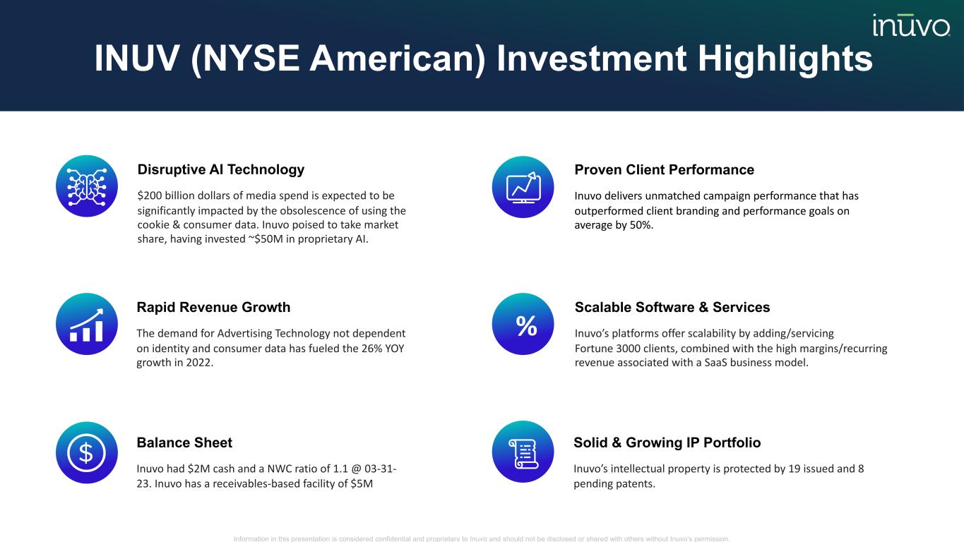INUV (NYSE American) Investment Highlights Rapid Revenue Growth The demand for Advertising Technology not dependent on identity and consumer data has fueled the 26% YOY growth in 2022. Proven Client Performance Inuvo delivers unmatched campaign performance that has outperformed client branding and performance goals on average by 50%. Disruptive AI Technology $200 billion dollars of media spend is expected to be significantly impacted by the obsolescence of using the cookie & consumer data. Inuvo poised to take market share, having invested ~$50M in proprietary AI. Scalable Software & Services Inuvo’s platforms offer scalability by adding/servicing Fortune 3000 clients, combined with the high margins/recurring revenue associated with a SaaS business model. Balance Sheet Inuvo had $2M cash and a NWC ratio of 1.1 @ 03-31- 23. Inuvo has a receivables-based facility of $5M Solid & Growing IP Portfolio Inuvo’s intellectual property is protected by 19 issued and 8 pending patents. % Information in this presentation is considered confidential and proprietary to Inuvo and should not be disclosed or shared with others without Inuvo’s permission.