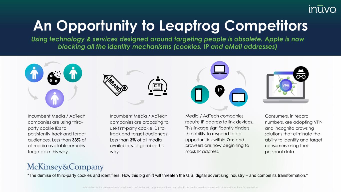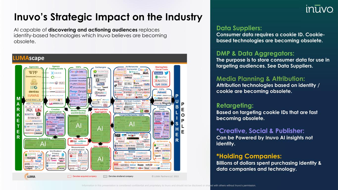 Information in this presentation is considered confidential and proprietary to Inuvo and should not be disclosed or shared with others without Inuvo’s permission. Incumbent Media / AdTech companies are using third- party cookie IDs to persistently track and target audiences. Less than 33% of all media available remains targetable this way. Incumbent Media / AdTech companies are proposing to use first-party cookie IDs to track and target audiences. Less than 3% of all media available is targetable this way. Media / AdTech companies require IP address to link devices. This linkage significantly hinders the ability to respond to ad opportunities within 7ms and browsers are now beginning to mask IP address. Consumers, in record numbers, are adopting VPN and incognito browsing solutions that eliminate the ability to identify and target consumers using their personal data. An Opportunity to Leapfrog Competitors Using technology & services designed around targeting people is obsolete. Apple is now blocking all the identity mechanisms (cookies, IP and eMail addresses) "The demise of third-party cookies and identifiers. How this big shift will threaten the U.S. digital advertising industry – and compel its transformation."