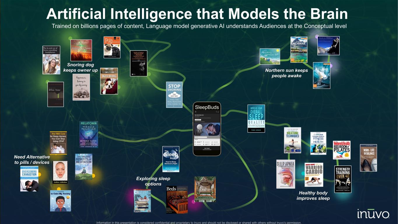 Artificial Intelligence that Models the Brain SleepBuds Information in this presentation is considered confidential and proprietary to Inuvo and should not be disclosed or shared with others without Inuvo’s permission. Snoring dog keeps owner up Northern sun keeps people awake Healthy body improves sleep Need Alternative to pills / devices Exploring sleep options Trained on billions pages of content, Language model generative AI understands Audiences at the Conceptual level
