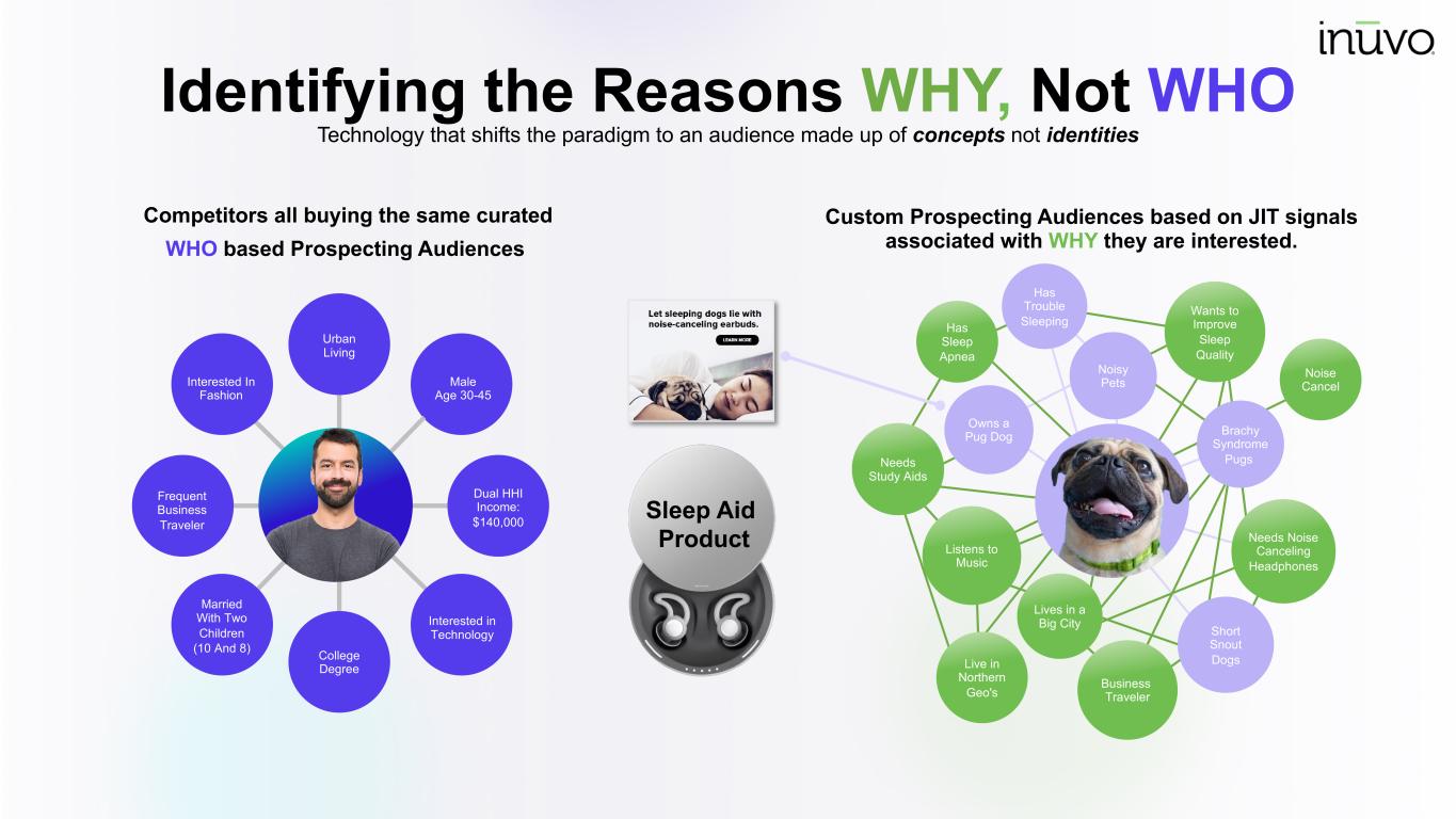 Identifying the Reasons WHY, Not WHO Urban Living Married With Two Children (10 And 8) Male Age 30-45 Dual HHI Income: $140,000 College Degree Interested in Technology Interested In Fashion Frequent Business Traveler Competitors all buying the same curated WHO based Prospecting Audiences Custom Prospecting Audiences based on JIT signals associated with WHY they are interested. Sleep Aid Product Technology that shifts the paradigm to an audience made up of concepts not identities Owns a Pug Dog Noisy Pets Needs Noise Canceling Headphones Wants to Improve Sleep Quality Listens to Music Needs Study Aids Live in Northern Geo's Has Sleep Apnea Has Trouble Sleeping Brachy Syndrome Pugs Lives in a Big City Business Traveler Short Snout Dogs Noise Cancel