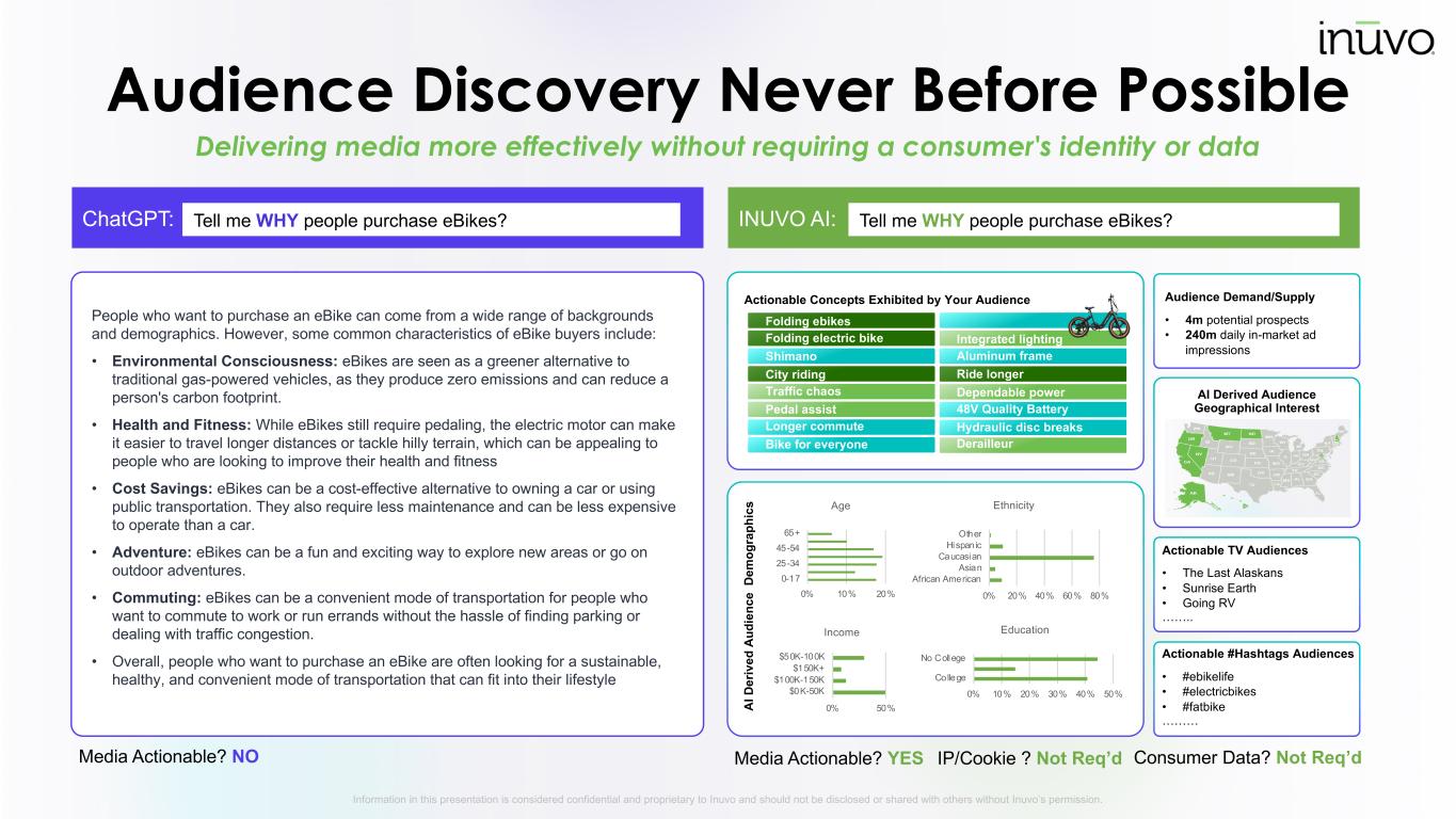 Information in this presentation is considered confidential and proprietary to Inuvo and should not be disclosed or shared with others without Inuvo’s permission. Tell me WHY people purchase eBikes?ChatGPT: Tell me WHY people purchase eBikes?INUVO AI: Media Actionable? NO Media Actionable? YES IP/Cookie ? Not Req’d Consumer Data? Not Req’d People who want to purchase an eBike can come from a wide range of backgrounds and demographics. However, some common characteristics of eBike buyers include: • Environmental Consciousness: eBikes are seen as a greener alternative to traditional gas-powered vehicles, as they produce zero emissions and can reduce a person's carbon footprint. • Health and Fitness: While eBikes still require pedaling, the electric motor can make it easier to travel longer distances or tackle hilly terrain, which can be appealing to people who are looking to improve their health and fitness • Cost Savings: eBikes can be a cost-effective alternative to owning a car or using public transportation. They also require less maintenance and can be less expensive to operate than a car. • Adventure: eBikes can be a fun and exciting way to explore new areas or go on outdoor adventures. • Commuting: eBikes can be a convenient mode of transportation for people who want to commute to work or run errands without the hassle of finding parking or dealing with traffic congestion. • Overall, people who want to purchase an eBike are often looking for a sustainable, healthy, and convenient mode of transportation that can fit into their lifestyle Audience Demand/Supply • 4m potential prospects • 240m daily in-market ad impressions A I D er iv ed A ud ie nc e D em og ra ph ic s 0% 10% 20% 30% 40% 50% College No College Education 0% 10% 20% 0-17 25-34 45-54 65+ Age 0% 20% 40% 60% 80% African American Asian Caucasian Hispanic Other Ethnicity 0% 50% $0K-50K $100K-150K $150K+ $50K-100K Income AI Derived Audience Geographical Interest Actionable Concepts Exhibited by Your Audience Folding ebikes Folding electric bike Shimano City riding Traffic chaos Pedal assist Longer commute Bike for everyone Integrated lighting Aluminum frame Ride longer Dependable power 48V Quality Battery Hydraulic disc breaks Derailleur Actionable TV Audiences • The Last Alaskans • Sunrise Earth • Going RV …….. Actionable #Hashtags Audiences • #ebikelife • #electricbikes • #fatbike ……… Delivering media more effectively without requiring a consumer's identity or data Audience Discovery Never Before Possible