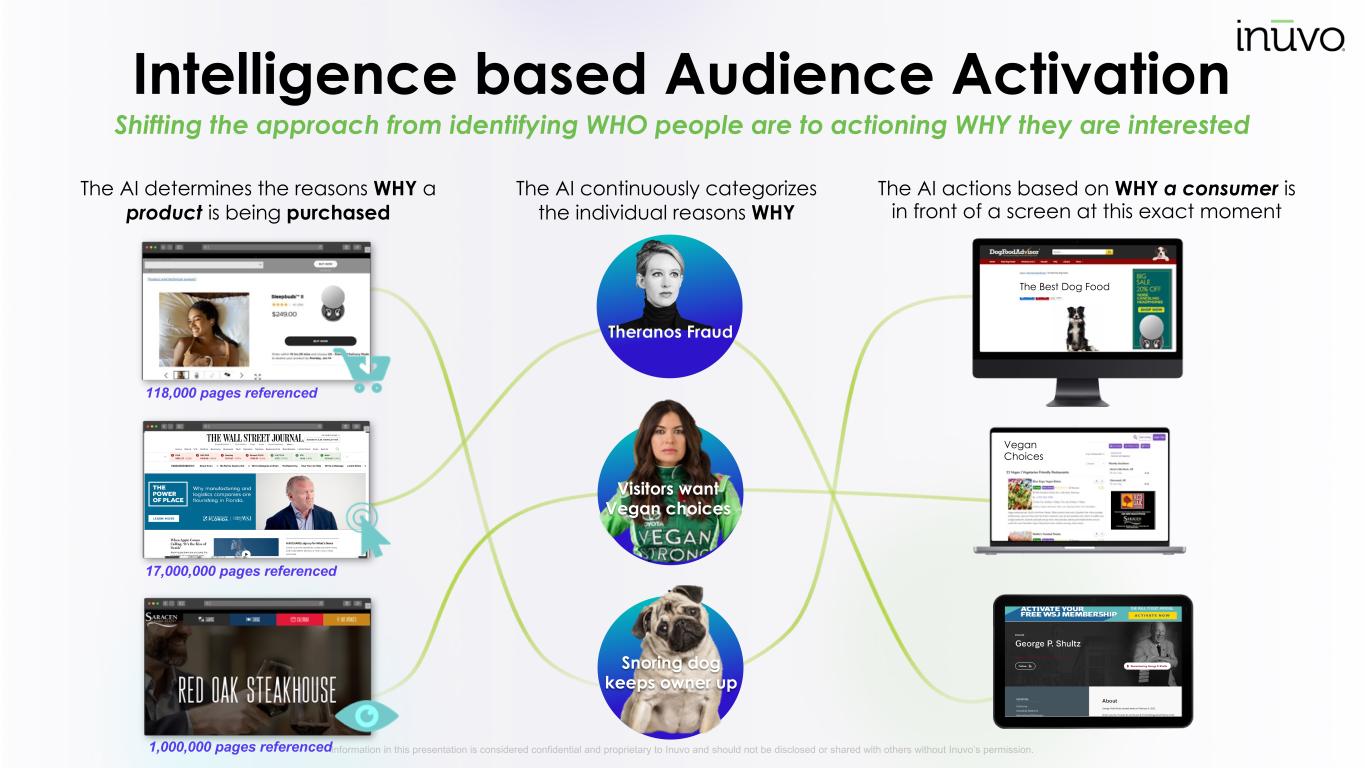 Information in this presentation is considered confidential and proprietary to Inuvo and should not be disclosed or shared with others without Inuvo’s permission. Visitors want Vegan choices The AI determines the reasons WHY a product is being purchased The AI actions based on WHY a consumer is in front of a screen at this exact moment The AI continuously categorizes the individual reasons WHY Snoring dog keeps owner up The Best Dog Food Vegan Choices Shifting the approach from identifying WHO people are to actioning WHY they are interested Intelligence based Audience Activation Theranos Fraud 17,000,000 pages referenced 1,000,000 pages referenced 118,000 pages referenced