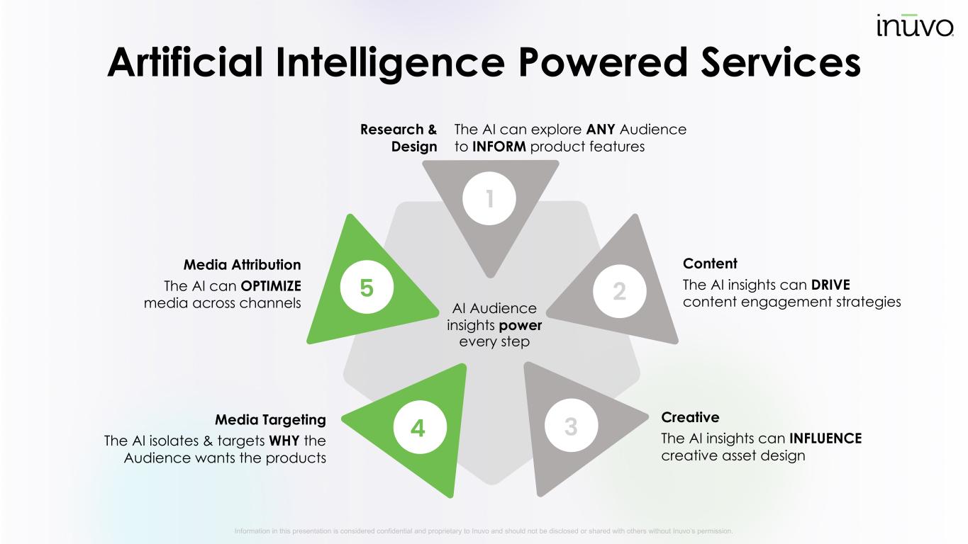 Information in this presentation is considered confidential and proprietary to Inuvo and should not be disclosed or shared with others without Inuvo’s permission. Media Targeting The AI isolates & targets WHY the Audience wants the products Artificial Intelligence Powered Services 1 25 4 3 The AI can explore ANY Audience to INFORM product features Research & Design Media Attribution The AI can OPTIMIZE media across channels AI Audience insights power every step Content The AI insights can DRIVE content engagement strategies Creative The AI insights can INFLUENCE creative asset design