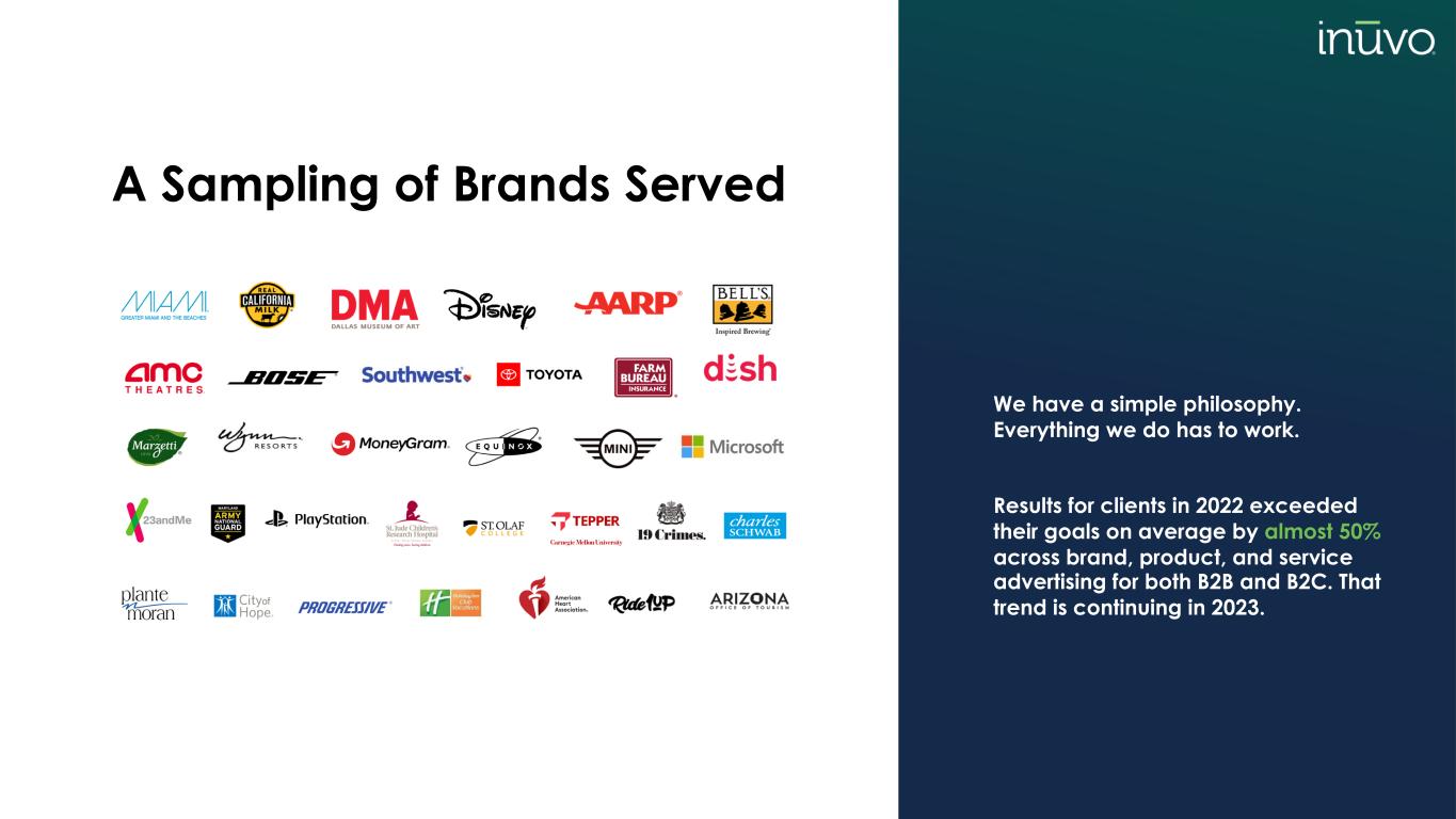 A Sampling of Brands Served We have a simple philosophy. Everything we do has to work. Results for clients in 2022 exceeded their goals on average by almost 50% across brand, product, and service advertising for both B2B and B2C. That trend is continuing in 2023.