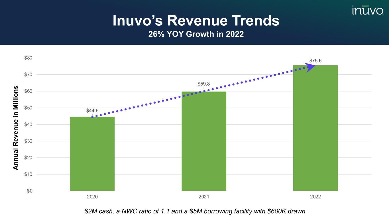 $44.6 $59.8 $75.6 $0 $10 $20 $30 $40 $50 $60 $70 $80 2020 2021 2022 A nn ua l R ev en ue in M ill io ns $2M cash, a NWC ratio of 1.1 and a $5M borrowing facility with $600K drawn Inuvo’s Revenue Trends 26% YOY Growth in 2022