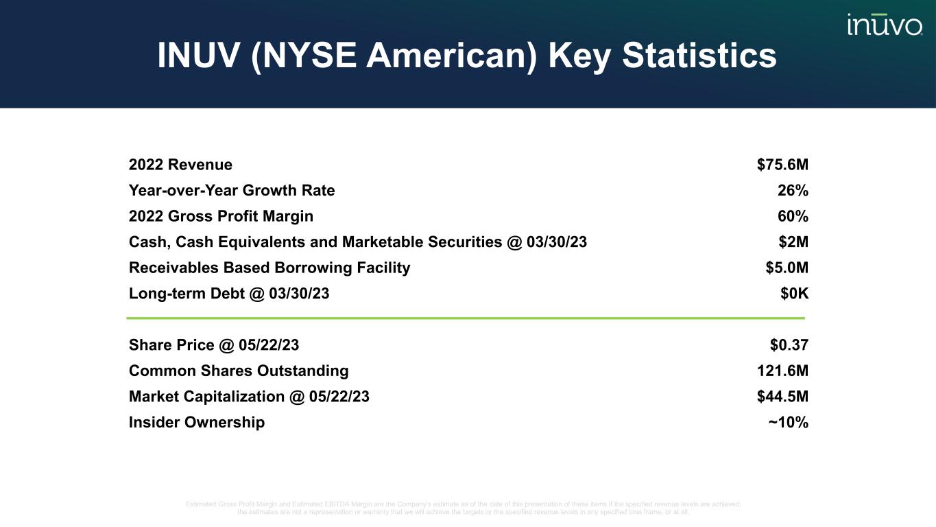 INUV (NYSE American) Key Statistics 2022 Revenue $75.6M Year-over-Year Growth Rate 26% 2022 Gross Profit Margin 60% Cash, Cash Equivalents and Marketable Securities @ 03/30/23 $2M Receivables Based Borrowing Facility $5.0M Long-term Debt @ 03/30/23 $0K Share Price @ 05/22/23 $0.37 Common Shares Outstanding 121.6M Market Capitalization @ 05/22/23 $44.5M Insider Ownership ~10% Estimated Gross Profit Margin and Estimated EBITDA Margin are the Company’s estimate as of the date of this presentation of these items if the specified revenue levels are achieved; the estimates are not a representation or warranty that we will achieve the targets or the specified revenue levels in any specified time frame, or at all.