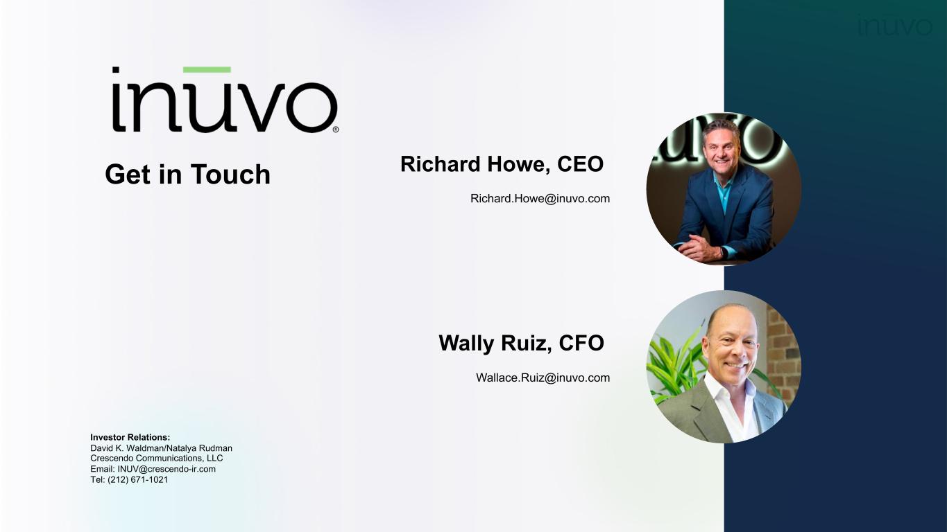 Get in Touch Richard Howe, CEO Richard.Howe@inuvo.com Wally Ruiz, CFO Wallace.Ruiz@inuvo.com Investor Relations: David K. Waldman/Natalya Rudman Crescendo Communications, LLC Email: INUV@crescendo-ir.com Tel: (212) 671-1021