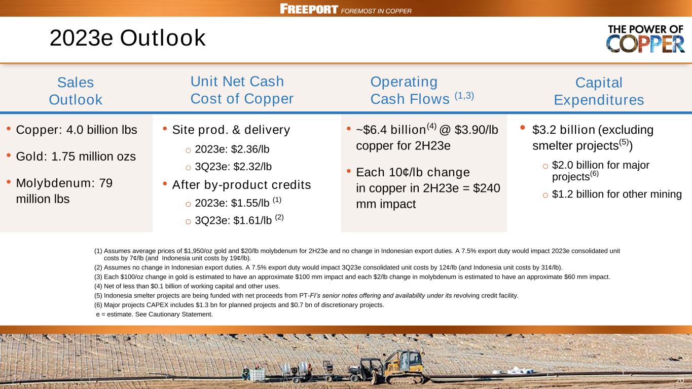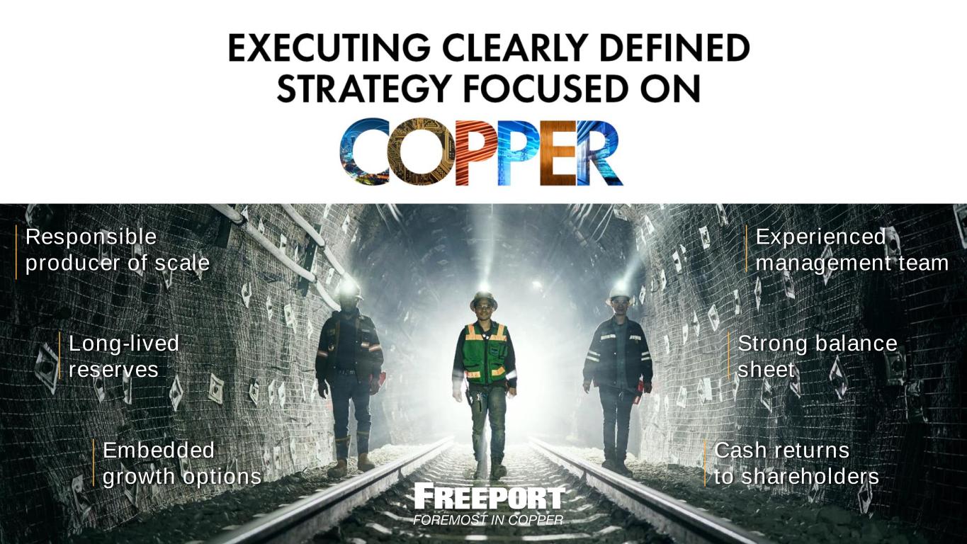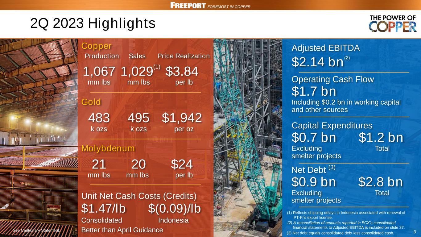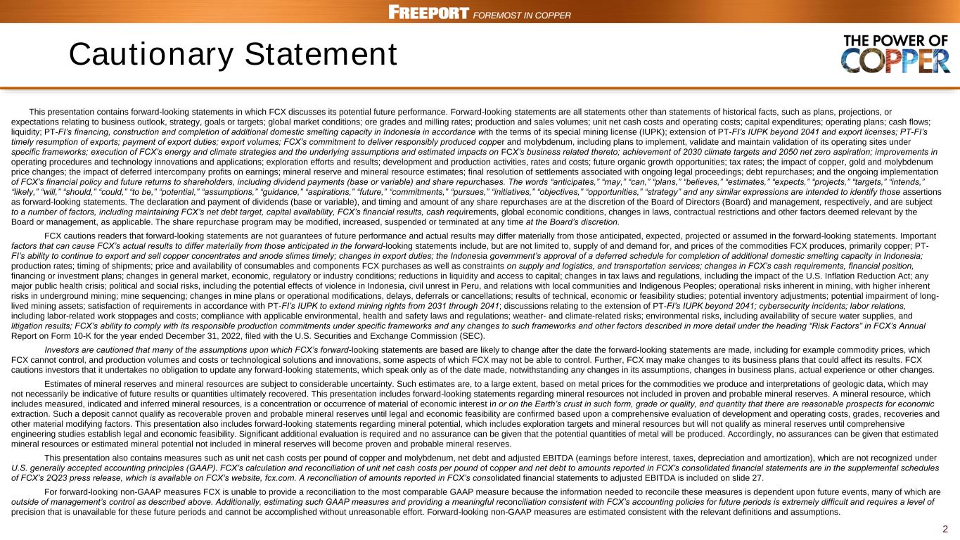 Cautionary Statement This presentation contains forward-looking statements in which FCX discusses its potential future performance. Forward-looking statements are all statements other than statements of historical facts, such as plans, projections, or expectations relating to business outlook, strategy, goals or targets; global market conditions; ore grades and milling rates; production and sales volumes; unit net cash costs and operating costs; capital expenditures; operating plans; cash flows; liquidity; PT-FI’s financing, construction and completion of additional domestic smelting capacity in Indonesia in accordance with the terms of its special mining license (IUPK); extension of PT-FI’s IUPK beyond 2041 and export licenses; PT-FI’s timely resumption of exports; payment of export duties; export volumes; FCX’s commitment to deliver responsibly produced copper and molybdenum, including plans to implement, validate and maintain validation of its operating sites under specific frameworks; execution of FCX’s energy and climate strategies and the underlying assumptions and estimated impacts on FCX’s business related thereto; achievement of 2030 climate targets and 2050 net zero aspiration; improvements in operating procedures and technology innovations and applications; exploration efforts and results; development and production activities, rates and costs; future organic growth opportunities; tax rates; the impact of copper, gold and molybdenum price changes; the impact of deferred intercompany profits on earnings; mineral reserve and mineral resource estimates; final resolution of settlements associated with ongoing legal proceedings; debt repurchases; and the ongoing implementation of FCX’s financial policy and future returns to shareholders, including dividend payments (base or variable) and share repurchases. The words “anticipates,” “may,” “can,” “plans,” “believes,” “estimates,” “expects,” “projects,” “targets,” “intends,” “likely,” “will,” “should,” “could,” “to be,” “potential,” “assumptions,” “guidance,” “aspirations,” “future,” “commitments,” “pursues,” “initiatives,” “objectives,” “opportunities,” “strategy” and any similar expressions are intended to identify those assertions as forward-looking statements. The declaration and payment of dividends (base or variable), and timing and amount of any share repurchases are at the discretion of the Board of Directors (Board) and management, respectively, and are subject to a number of factors, including maintaining FCX’s net debt target, capital availability, FCX’s financial results, cash requirements, global economic conditions, changes in laws, contractual restrictions and other factors deemed relevant by the Board or management, as applicable. The share repurchase program may be modified, increased, suspended or terminated at any time at the Board’s discretion. FCX cautions readers that forward-looking statements are not guarantees of future performance and actual results may differ materially from those anticipated, expected, projected or assumed in the forward-looking statements. Important factors that can cause FCX’s actual results to differ materially from those anticipated in the forward-looking statements include, but are not limited to, supply of and demand for, and prices of the commodities FCX produces, primarily copper; PT- FI’s ability to continue to export and sell copper concentrates and anode slimes timely; changes in export duties; the Indonesia government’s approval of a deferred schedule for completion of additional domestic smelting capacity in Indonesia; production rates; timing of shipments; price and availability of consumables and components FCX purchases as well as constraints on supply and logistics, and transportation services; changes in FCX’s cash requirements, financial position, financing or investment plans; changes in general market, economic, regulatory or industry conditions; reductions in liquidity and access to capital; changes in tax laws and regulations, including the impact of the U.S. Inflation Reduction Act; any major public health crisis; political and social risks, including the potential effects of violence in Indonesia, civil unrest in Peru, and relations with local communities and Indigenous Peoples; operational risks inherent in mining, with higher inherent risks in underground mining; mine sequencing; changes in mine plans or operational modifications, delays, deferrals or cancellations; results of technical, economic or feasibility studies; potential inventory adjustments; potential impairment of long- lived mining assets; satisfaction of requirements in accordance with PT-FI’s IUPK to extend mining rights from 2031 through 2041; discussions relating to the extension of PT-FI’s IUPK beyond 2041; cybersecurity incidents; labor relations, including labor-related work stoppages and costs; compliance with applicable environmental, health and safety laws and regulations; weather- and climate-related risks; environmental risks, including availability of secure water supplies, and litigation results; FCX’s ability to comply with its responsible production commitments under specific frameworks and any changes to such frameworks and other factors described in more detail under the heading “Risk Factors” in FCX’s Annual Report on Form 10-K for the year ended December 31, 2022, filed with the U.S. Securities and Exchange Commission (SEC). Investors are cautioned that many of the assumptions upon which FCX’s forward-looking statements are based are likely to change after the date the forward-looking statements are made, including for example commodity prices, which FCX cannot control, and production volumes and costs or technological solutions and innovations, some aspects of which FCX may not be able to control. Further, FCX may make changes to its bus