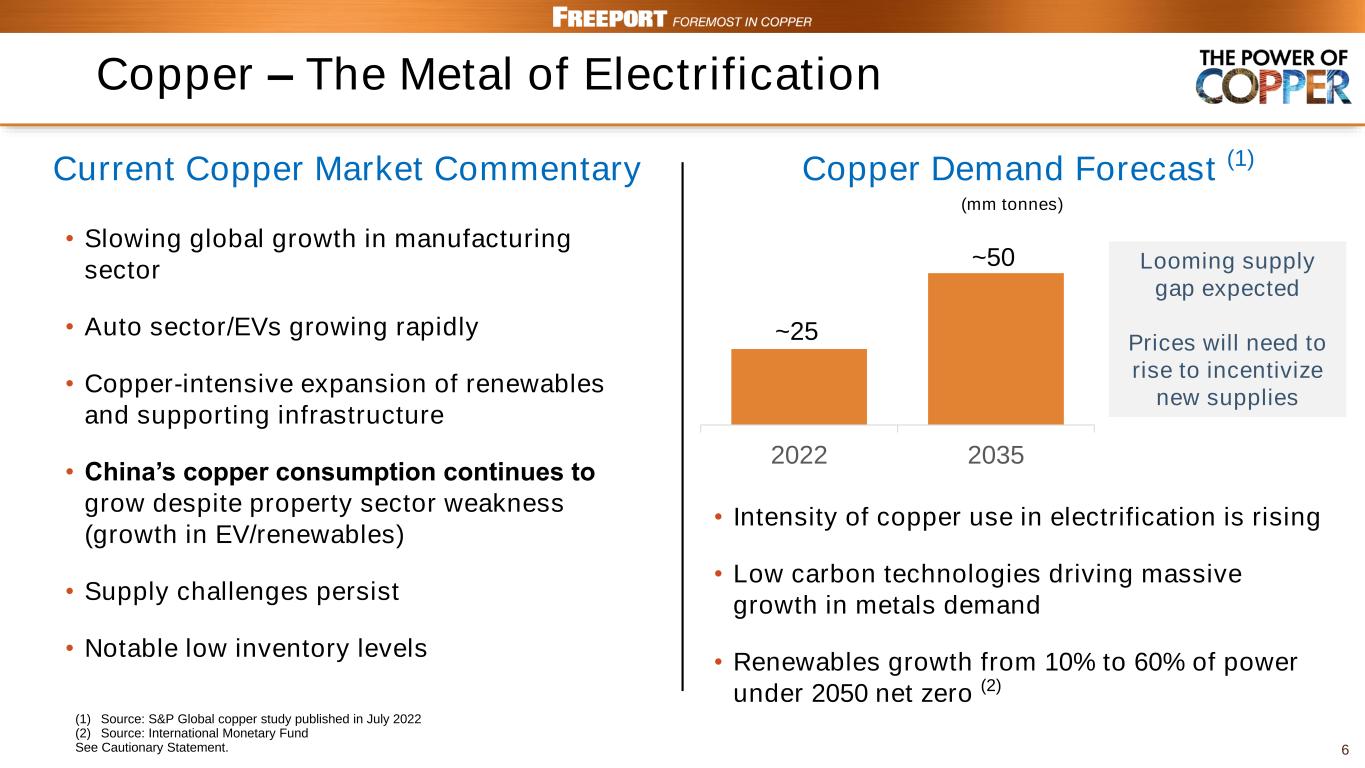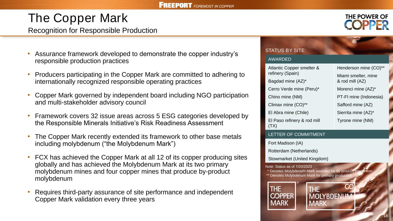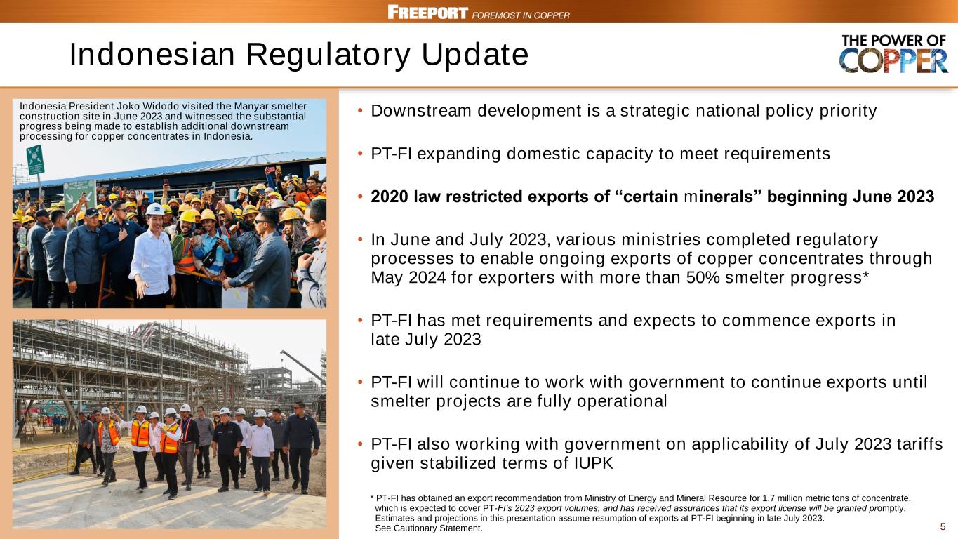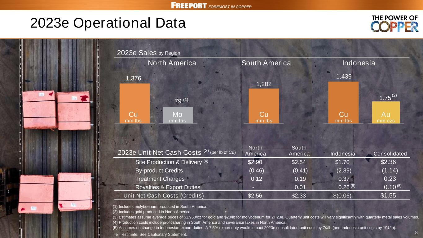 Cautionary Statement This presentation contains forward-looking statements in which FCX discusses its potential future performance. Forward-looking statements are all statements other than statements of historical facts, such as plans, projections, or expectations relating to business outlook, strategy, goals or targets; global market conditions; ore grades and milling rates; production and sales volumes; unit net cash costs and operating costs; capital expenditures; operating plans; cash flows; liquidity; PT-FI’s financing, construction and completion of additional domestic smelting capacity in Indonesia in accordance with the terms of its special mining license (IUPK); extension of PT-FI’s IUPK beyond 2041 and export licenses; PT-FI’s timely resumption of exports; payment of export duties; export volumes; FCX’s commitment to deliver responsibly produced copper and molybdenum, including plans to implement, validate and maintain validation of its operating sites under specific frameworks; execution of FCX’s energy and climate strategies and the underlying assumptions and estimated impacts on FCX’s business related thereto; achievement of 2030 climate targets and 2050 net zero aspiration; improvements in operating procedures and technology innovations and applications; exploration efforts and results; development and production activities, rates and costs; future organic growth opportunities; tax rates; the impact of copper, gold and molybdenum price changes; the impact of deferred intercompany profits on earnings; mineral reserve and mineral resource estimates; final resolution of settlements associated with ongoing legal proceedings; debt repurchases; and the ongoing implementation of FCX’s financial policy and future returns to shareholders, including dividend payments (base or variable) and share repurchases. The words “anticipates,” “may,” “can,” “plans,” “believes,” “estimates,” “expects,” “projects,” “targets,” “intends,” “likely,” “will,” “should,” “could,” “to be,” “potential,” “assumptions,” “guidance,” “aspirations,” “future,” “commitments,” “pursues,” “initiatives,” “objectives,” “opportunities,” “strategy” and any similar expressions are intended to identify those assertions as forward-looking statements. The declaration and payment of dividends (base or variable), and timing and amount of any share repurchases are at the discretion of the Board of Directors (Board) and management, respectively, and are subject to a number of factors, including maintaining FCX’s net debt target, capital availability, FCX’s financial results, cash requirements, global economic conditions, changes in laws, contractual restrictions and other factors deemed relevant by the Board or management, as applicable. The share repurchase program may be modified, increased, suspended or terminated at any time at the Board’s discretion. FCX cautions readers that forward-looking statements are not guarantees of future performance and actual results may differ materially from those anticipated, expected, projected or assumed in the forward-looking statements. Important factors that can cause FCX’s actual results to differ materially from those anticipated in the forward-looking statements include, but are not limited to, supply of and demand for, and prices of the commodities FCX produces, primarily copper; PT- FI’s ability to continue to export and sell copper concentrates and anode slimes timely; changes in export duties; the Indonesia government’s approval of a deferred schedule for completion of additional domestic smelting capacity in Indonesia; production rates; timing of shipments; price and availability of consumables and components FCX purchases as well as constraints on supply and logistics, and transportation services; changes in FCX’s cash requirements, financial position, financing or investment plans; changes in general market, economic, regulatory or industry conditions; reductions in liquidity and access to capital; changes in tax laws and regulations, including the impact of the U.S. Inflation Reduction Act; any major public health crisis; political and social risks, including the potential effects of violence in Indonesia, civil unrest in Peru, and relations with local communities and Indigenous Peoples; operational risks inherent in mining, with higher inherent risks in underground mining; mine sequencing; changes in mine plans or operational modifications, delays, deferrals or cancellations; results of technical, economic or feasibility studies; potential inventory adjustments; potential impairment of long- lived mining assets; satisfaction of requirements in accordance with PT-FI’s IUPK to extend mining rights from 2031 through 2041; discussions relating to the extension of PT-FI’s IUPK beyond 2041; cybersecurity incidents; labor relations, including labor-related work stoppages and costs; compliance with applicable environmental, health and safety laws and regulations; weather- and climate-related risks; environmental risks, including availability of secure water supplies, and litigation results; FCX’s ability to comply with its responsible production commitments under specific frameworks and any changes to such frameworks and other factors described in more detail under the heading “Risk Factors” in FCX’s Annual Report on Form 10-K for the year ended December 31, 2022, filed with the U.S. Securities and Exchange Commission (SEC). Investors are cautioned that many of the assumptions upon which FCX’s forward-looking statements are based are likely to change after the date the forward-looking statements are made, including for example commodity prices, which FCX cannot control, and production volumes and costs or technological solutions and innovations, some aspects of which FCX may not be able to control. Further, FCX may make changes to its bus