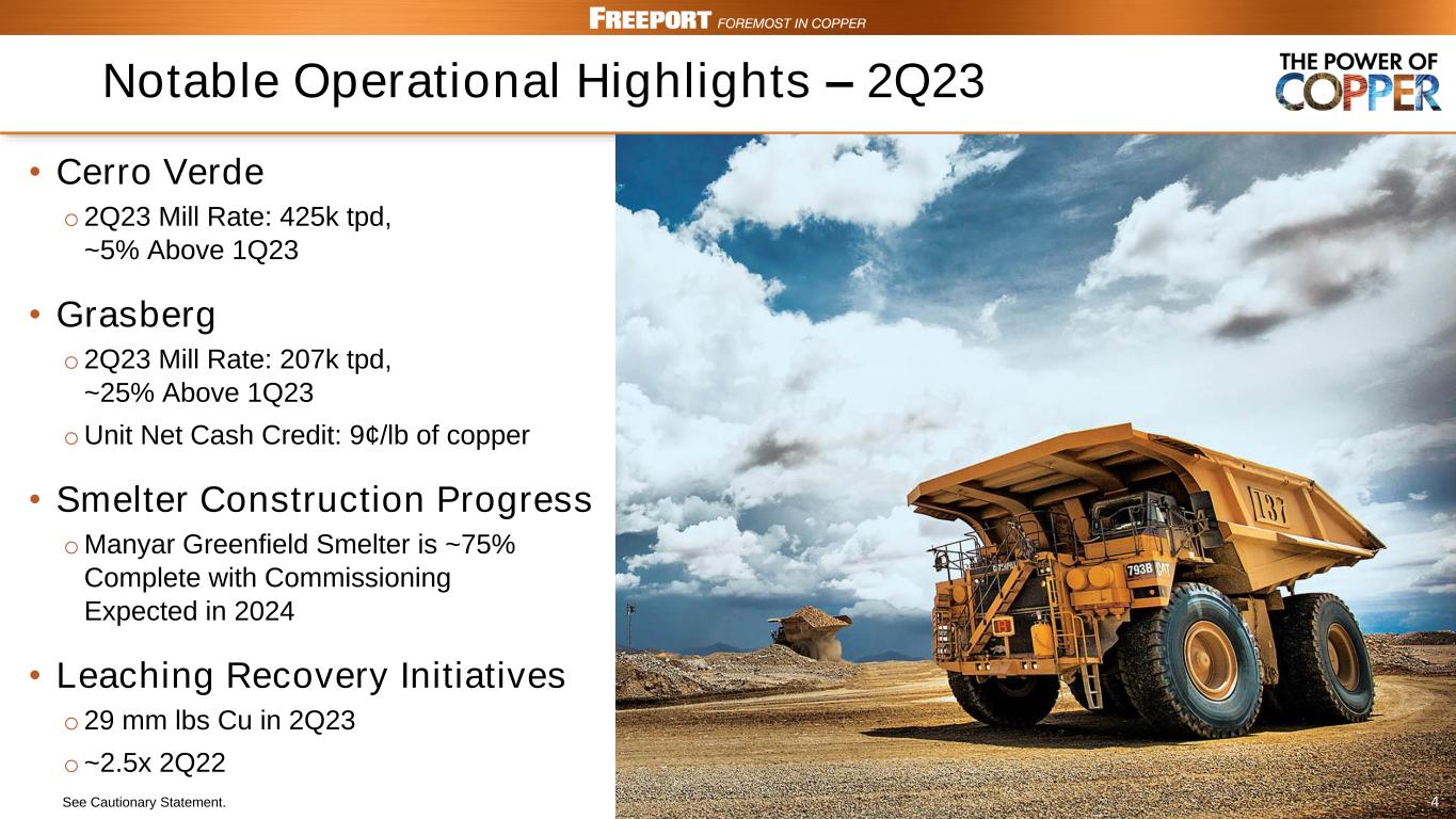 Unit Net Cash Costs (Credits) $1.47/lb $(0.09)/lb Consolidated Indonesia Better than April Guidance 3 2Q 2023 Highlights Operating Cash Flow $1.7 bn Including $0.2 bn in working capital and other sources Capital Expenditures $0.7 bn $1.2 bn Excluding Total smelter projects (2) A reconciliation of amounts reported in FCX’s consolidated financial statements to Adjusted EBITDA is included on slide 27. (3) Net debt equals consolidated debt less consolidated cash. See Cautionary Statement. Copper Production Sales Price Realization 1,067 1,029 (1) $3.84 mm lbs mm lbs per lb Gold 483 495 $1,942 k ozs k ozs per oz Molybdenum 21 20 $24 mm lbs mm lbs per lb (1) Reflects shipping delays in Indonesia associated with renewal of PT-FI's export license. Adjusted EBITDA $2.14 bn (2) Net Debt (3) $0.9 bn $2.8 bn Excluding Total smelter projects