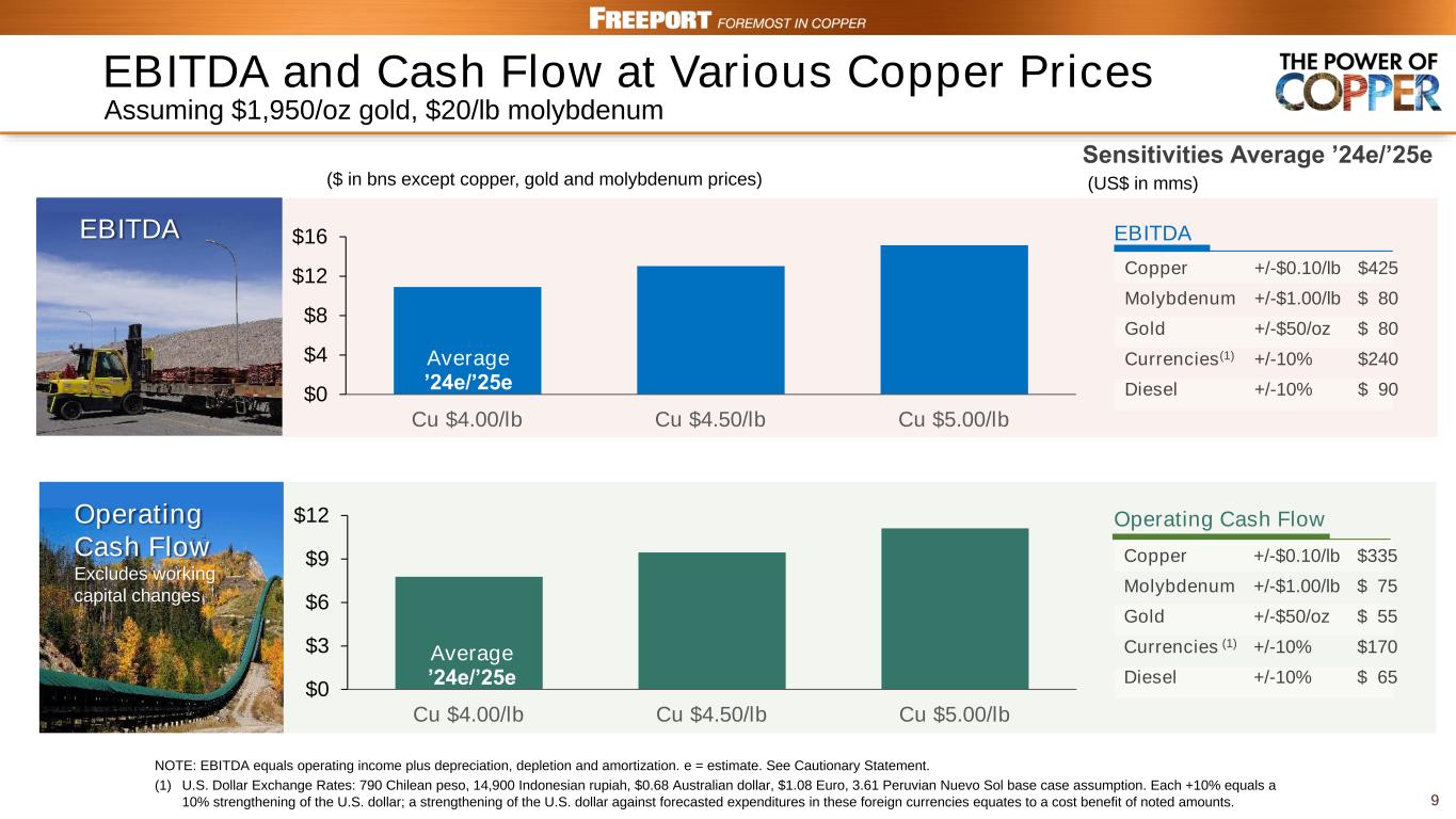 8 (1) (1) Includes molybdenum produced in South America. (2) Includes gold produced in North America. (3) Estimates assume average prices of $1,950/oz for gold and $20/lb for molybdenum for 2H23e. Quarterly unit costs will vary significantly with quarterly metal sales volumes. (4) Production costs include profit sharing in South America and severance taxes in North America. (5) Assumes no change in Indonesian export duties. A 7.5% export duty would impact 2023e consolidated unit costs by 7¢/lb (and Indonesia unit costs by 19¢/lb). 1,202 79 1,376 1,439 1.75 (2) North America IndonesiaSouth America by Region2023e Sales Mo mm lbs Cu mm lbs Au mm ozs (per lb of Cu) Site Production & Delivery (4) $2.90 $2.54 $1.70 $2.36 By-product Credits (0.46) (0.41) (2.39) (1.14) Treatment Charges 0.12 0.19 0.37 0.23 Royalties & Export Duties - 0.01 0.26 0.10 Unit Net Cash Costs (Credits) $2.56 $2.33 $(0.06) $1.55 2023e Unit Net Cash Costs (3) North South America America Indonesia Consolidated Cu mm lbs Cu mm lbs e = estimate. See Cautionary Statement. 2023e Operational Data (5) (5)