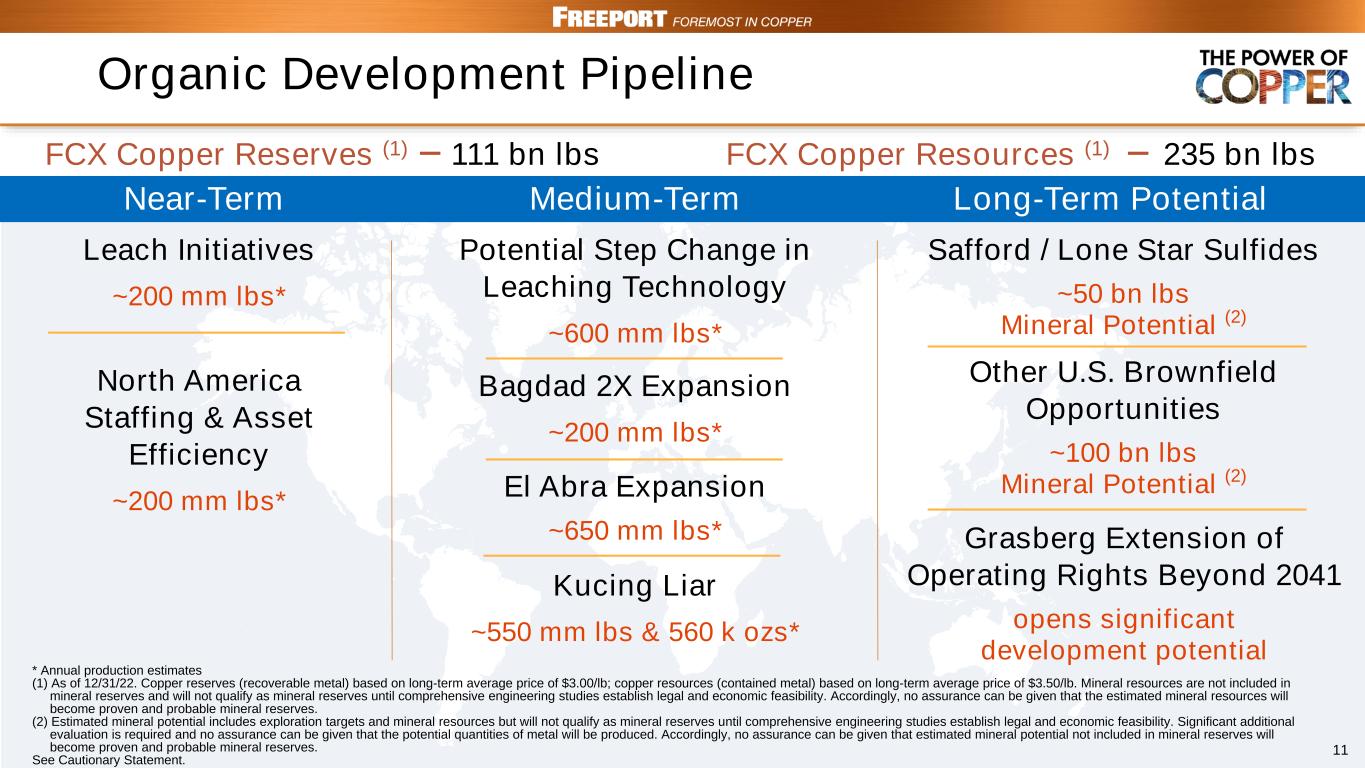 2022 2023e 2024e Consolidated Capital Expenditures Major Projects (1) See slide 25; Indonesia smelter projects are being funded with net proceeds from PT-FI’s April 2022 senior notes offering and availability under its revolving credit facility. (2) Major projects include CAPEX associated with Grasberg underground development and supporting mill and power capital costs ($1.1 bn in 2023e and $0.7 bn in 2024e). For details of discretionary spending see slide 24. NOTE: Amounts include capitalized interest. Discretionary CAPEX and smelter spending will be excluded from the free cash flow (as defined on slide 12) calculation for purposes of the performance-based payout framework. e= estimate. See Cautionary Statement. Other $1.0 ($ in bns) $1.7(2) $2.7 $1.3(2) $1.2 $3.2 $1.5 $1.0(2) Planned Discretionary Planned Discretionary $1.3 $0.7 $3.8 $1.4 Planned Discretionary Other Other Excluding Indonesia Smelter Projects CAPEX (1) 10