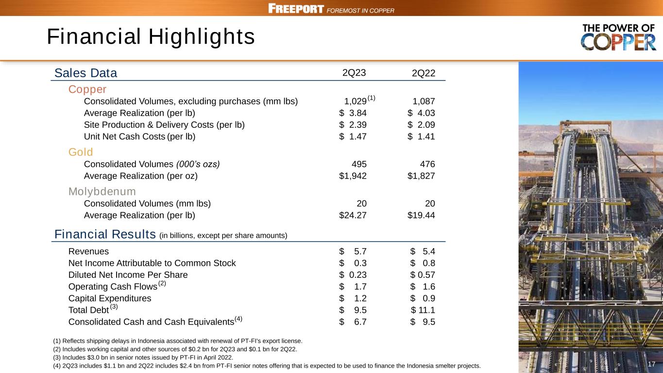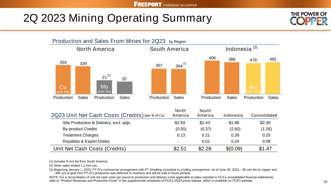 Financial Highlights Copper Consolidated Volumes, excluding purchases (mm lbs) 1,029 1,087 Average Realization (per lb) $ 3.84 $ 4.03 Site Production & Delivery Costs (per lb) $ 2.39 $ 2.09 Unit Net Cash Costs (per lb) $ 1.47 $ 1.41 Gold Consolidated Volumes (000’s ozs) 495 476 Average Realization (per oz) $1,942 $1,827 Molybdenum Consolidated Volumes (mm lbs) 20 20 Average Realization (per lb) $24.27 $19.44 2Q23 (1) Reflects shipping delays in Indonesia associated with renewal of PT-FI's export license. (2) Includes working capital and other sources of $0.2 bn for 2Q23 and $0.1 bn for 2Q22. (3) Includes $3.0 bn in senior notes issued by PT-FI in April 2022. (4) 2Q23 includes $1.1 bn and 2Q22 includes $2.4 bn from PT-FI senior notes offering that is expected to be used to finance the Indonesia smelter projects. Revenues $ 5.7 $ 5.4 Net Income Attributable to Common Stock $ 0.3 $ 0.8 Diluted Net Income Per Share $ 0.23 $ 0.57 Operating Cash Flows $ 1.7 $ 1.6 Capital Expenditures $ 1.2 $ 0.9 Total Debt $ 9.5 $ 11.1 Consolidated Cash and Cash Equivalents $ 6.7 $ 9.5 (2) (in billions, except per share amounts) Sales Data Financial Results 2Q22 17 (3) (4) (1)