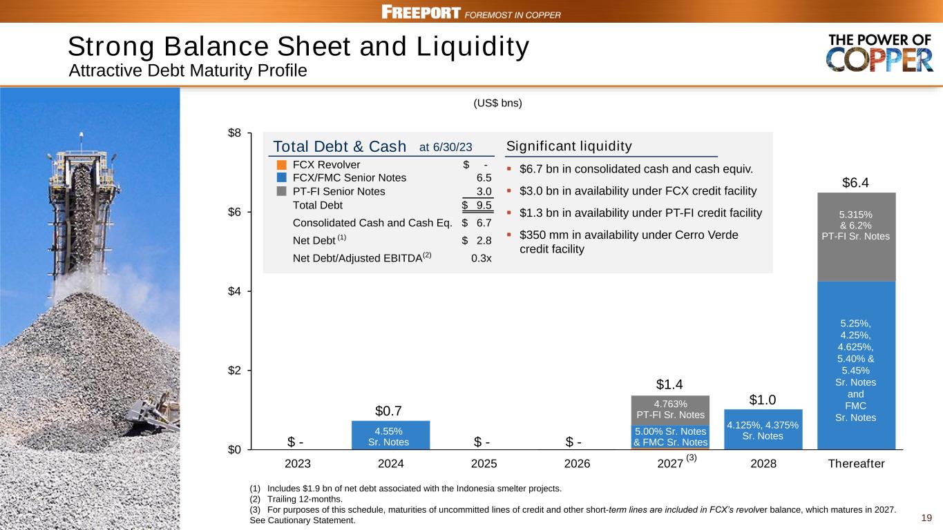 $0 $2 $4 $6 $8 2023 2024 2025 2026 2027 2028 Thereafter Strong Balance Sheet and Liquidity (US$ bns) $6.4 5.25%, 4.25%, 4.625%, 5.40% & 5.45% Sr. Notes and FMC Sr. Notes 3.875% Sr. Notes $0.7 4.55% Sr. Notes FCX Revolver $ - FCX/FMC Senior Notes 6.5 PT-FI Senior Notes 3.0 Total Debt $ 9.5 Consolidated Cash and Cash Eq. $ 6.7 Net Debt (1) $ 2.8 Net Debt/Adjusted EBITDA(2) 0.3x $ - at 6/30/23Total Debt & Cash $ - $1.4 (1) Includes $1.9 bn of net debt associated with the Indonesia smelter projects. (2) Trailing 12-months. (3) For purposes of this schedule, maturities of uncommitted lines of credit and other short-term lines are included in FCX’s revolver balance, which matures in 2027. See Cautionary Statement. (3) 5.00% Sr. Notes & FMC Sr. Notes 4.763% PT-FI Sr. Notes 5.315% & 6.2% PT-FI Sr. Notes Significant liquidity ▪ $6.7 bn in consolidated cash and cash equiv. ▪ $3.0 bn in availability under FCX credit facility ▪ $1.3 bn in availability under PT-FI credit facility ▪ $350 mm in availability under Cerro Verde credit facility 4.55% Sr. Notes 4.125%, 4.375% Sr. Notes $1.0 Attractive Debt Maturity Profile 19 $ -