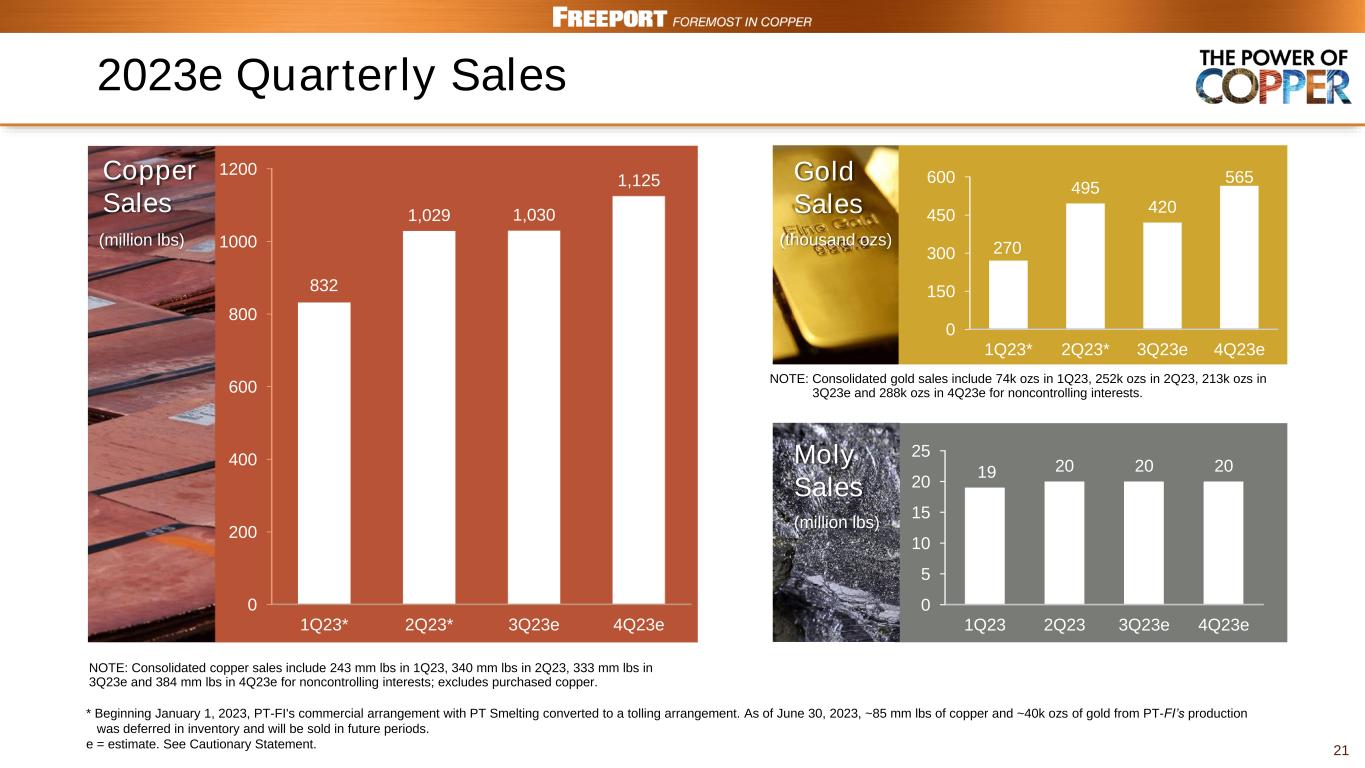 2023e Outlook Sales Outlook Unit Net Cash Cost of Copper Operating Cash Flows (1,3) Capital Expenditures (1) Assumes average prices of $1,950/oz gold and $20/lb molybdenum for 2H23e and no change in Indonesian export duties. A 7.5% export duty would impact 2023e consolidated unit costs by 7¢/lb (and Indonesia unit costs by 19¢/lb). (2) Assumes no change in Indonesian export duties. A 7.5% export duty would impact 3Q23e consolidated unit costs by 12¢/lb (and Indonesia unit costs by 31¢/lb). (3) Each $100/oz change in gold is estimated to have an approximate $100 mm impact and each $2/lb change in molybdenum is estimated to have an approximate $60 mm impact. (4) Net of less than $0.1 billion of working capital and other uses. (5) Indonesia smelter projects are being funded with net proceeds from PT-FI’s senior notes offering and availability under its revolving credit facility. (6) Major projects CAPEX includes $1.3 bn for planned projects and $0.7 bn of discretionary projects. e = estimate. See Cautionary Statement. • Copper: 4.0 billion lbs • Gold: 1.75 million ozs • Molybdenum: 79 million lbs • ~$6.4 billion(4) @ $3.90/lb copper for 2H23e • Each 10¢/lb change in copper in 2H23e = $240 mm impact • Site prod. & delivery o 2023e: $2.36/lb o 3Q23e: $2.32/lb • After by-product credits o 2023e: $1.55/lb (1) o 3Q23e: $1.61/lb (2) • $3.2 billion (excluding smelter projects(5)) o $2.0 billion for major projects(6) o $1.2 billion for other mining 20