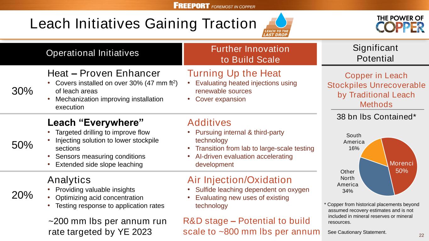 22 Operational Initiatives Heat – Proven Enhancer • Covers installed on over 30% (47 mm ft2) of leach areas • Mechanization improving installation execution Leach “Everywhere” • Targeted drilling to improve flow • Injecting solution to lower stockpile sections • Sensors measuring conditions • Extended side slope leaching Analytics • Providing valuable insights • Optimizing acid concentration • Testing response to application rates Further Innovation to Build Scale 30% 50% 20% Turning Up the Heat • Evaluating heated injections using renewable sources • Cover expansion Additives • Pursuing internal & third-party technology • Transition from lab to large-scale testing • AI-driven evaluation accelerating development Air Injection/Oxidation • Sulfide leaching dependent on oxygen • Evaluating new uses of existing technology South America 16% Other North America 34% Morenci 50% Copper in Leach Stockpiles Unrecoverable by Traditional Leach Methods 38 bn lbs Contained* * Copper from historical placements beyond assumed recovery estimates and is not included in mineral reserves or mineral resources. Significant Potential Leach Initiatives Gaining Traction See Cautionary Statement. ~200 mm lbs per annum run rate targeted by YE 2023 R&D stage – Potential to build scale to ~800 mm lbs per annum