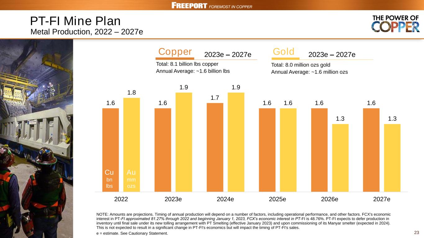 Metal Production, 2022 – 2027e NOTE: Amounts are projections. Timing of annual production will depend on a number of factors, including operational performance, and other factors. FCX's economic interest in PT-FI approximated 81.27% through 2022 and beginning January 1, 2023, FCX’s economic interest in PT-FI is 48.76%. PT-FI expects to defer production in inventory until final sale under its new tolling arrangement with PT Smelting (effective January 2023) and upon commissioning of its Manyar smelter (expected in 2024). This is not expected to result in a significant change in PT-FI's economics but will impact the timing of PT-FI's sales. e = estimate. See Cautionary Statement. 1.6 1.6 1.7 1.6 1.6 1.6 1.8 1.9 1.9 1.6 1.3 1.3 2022 2023e 2024e 2025e 2026e 2027e Cu bn lbs Au mm ozs Total: 8.1 billion lbs copper Annual Average: ~1.6 billion lbs 2023e – 2027e Copper Total: 8.0 million ozs gold Annual Average: ~1.6 million ozs 2023e – 2027e Gold PT-FI Mine Plan 23