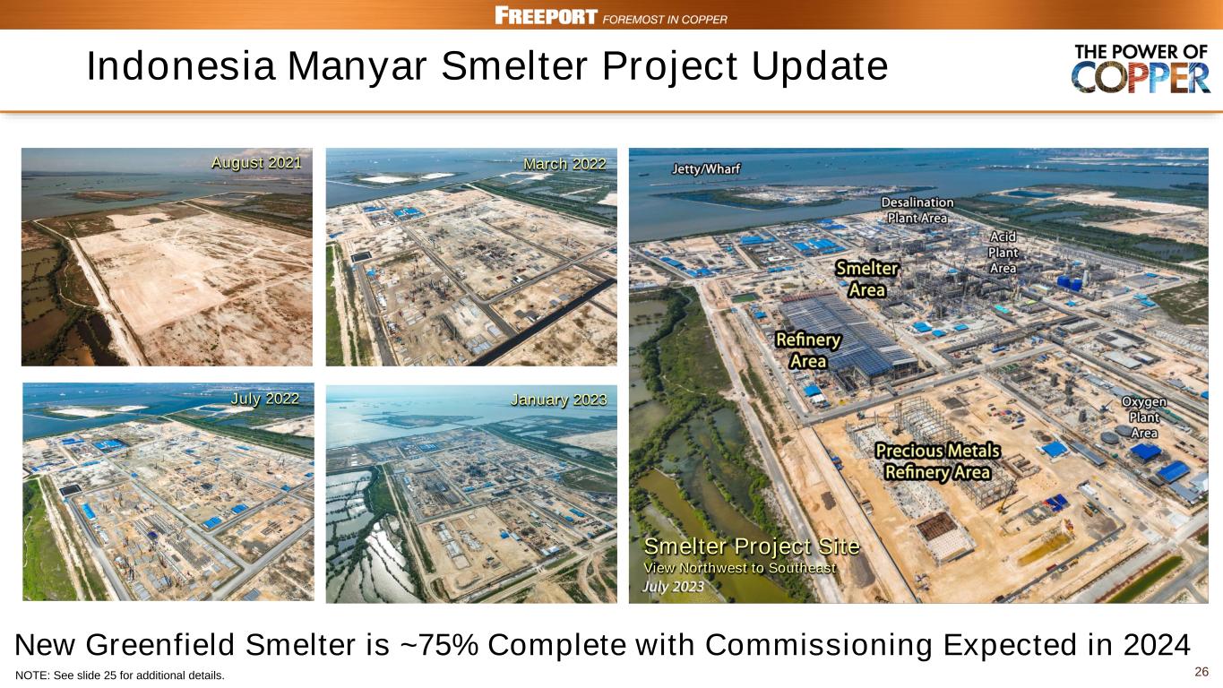 Oxygen Plant Smelter Refinery Acid Plant Admin Expansion Project General Layout Refinery Expansion Oxygen Plant Acid Plant Water TankCooling Pond Desal (1) Based on target price of $2.8 bn for construction contract (excludes capitalized interest, owner’s costs and commissioning) and $0.2 bn for investment in a desalinization plant for the smelter. Indonesia Downstream Processing Activities Precious Metals Refinery (PMR) • To be constructed to process gold and silver from Manyar smelter and PT Smelting • Construction is in progress with commission expected during 2024 • Cost estimate: ~$525 mm Greenfield Smelter (Manyar) • 1.7 mm mt of annual concentrate capacity • Designed to be world’s largest single line flash smelter/convertor facility • ~75% complete • Project expected to be commissioned in 2024 • Cost estimate: ~$3.0 bn (1) • 30% increase to existing smelter to add 300,000 mt of annual concentrate capacity • Completed commercial arrangements in 4Q21 • Target completion of YE 2023, over 85% complete • Cost estimate: ~$250 mm PT Smelting Expansion 25e = estimate. See Cautionary Statement. (2) Manyar smelter project expected to be funded with net proceeds from PT-FI’s senior notes offering and availability under its revolving credit facility. Capital spending on the Manyar smelter will be debt financed and will not be deducted from cash available for returns to FCX shareholders. Estimates exclude capitalized interest, owner’s costs and commissioning. Estimate of Spending on Manyar Smelter & PMR (shared 51% PT Inalum/49% FCX)(2) $0.2 $0.8 $1.6 $0.9 2021 2022 2023e 2024e ($ in bns) Refinery Plant Extension