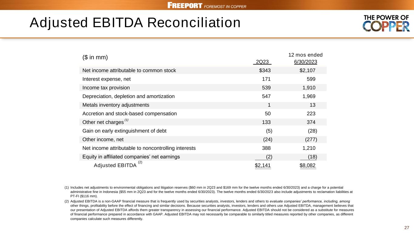 Adjusted EBITDA Reconciliation ($ in mm) 12 mos ended 2Q23 6/30/2023 Net income attributable to common stock $343 $2,107 Interest expense, net 171 599 Income tax provision 539 1,910 Depreciation, depletion and amortization 547 1,969 Metals inventory adjustments 1 13 Accretion and stock-based compensation 50 223 Other net charges (1) 133 374 Gain on early extinguishment of debt (5) (28) Other income, net (24) (277) Net income attributable to noncontrolling interests 388 1,210 Equity in affiliated companies’ net earnings (2) (18) Adjusted EBITDA (2) $2,141 $8,082 27 (1) Includes net adjustments to environmental obligations and litigation reserves ($60 mm in 2Q23 and $169 mm for the twelve months ended 6/30/2023) and a charge for a potential administrative fine in Indonesia ($55 mm in 2Q23 and for the twelve months ended 6/30/2023). The twelve months ended 6/30/2023 also include adjustments to reclamation liabilities at PT-FI ($116 mm). (2) Adjusted EBITDA is a non-GAAP financial measure that is frequently used by securities analysts, investors, lenders and others to evaluate companies’ performance, including, among other things, profitability before the effect of financing and similar decisions. Because securities analysts, investors, lenders and others use Adjusted EBITDA, management believes that our presentation of Adjusted EBITDA affords them greater transparency in assessing our financial performance. Adjusted EBITDA should not be considered as a substitute for measures of financial performance prepared in accordance with GAAP. Adjusted EBITDA may not necessarily be comparable to similarly titled measures reported by other companies, as different companies calculate such measures differently.