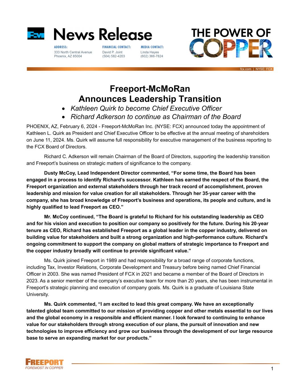 1 Freeport-McMoRan Announces Leadership Transition  Kathleen Quirk to become Chief Executive Officer  Richard Adkerson to continue as Chairman of the Board PHOENIX, AZ, February 6, 2024 - Freeport-McMoRan Inc. (NYSE: FCX) announced today the appointment of Kathleen L. Quirk as President and Chief Executive Officer to be effective at the annual meeting of shareholders on June 11, 2024. Ms. Quirk will assume full responsibility for executive management of the business reporting to the FCX Board of Directors. Richard C. Adkerson will remain Chairman of the Board of Directors, supporting the leadership transition and Freeport’s business on strategic matters of significance to the company. Dusty McCoy, Lead Independent Director commented, “For some time, the Board has been engaged in a process to identify Richard’s successor. Kathleen has earned the respect of the Board, the Freeport organization and external stakeholders through her track record of accomplishment, proven leadership and mission for value creation for all stakeholders. Through her 35-year career with the company, she has broad knowledge of Freeport’s business and operations, its people and culture, and is highly qualified to lead Freeport as CEO.” Mr. McCoy continued, “The Board is grateful to Richard for his outstanding leadership as CEO and for his vision and execution to position our company so positively for the future. During his 20-year tenure as CEO, Richard has established Freeport as a global leader in the copper industry, delivered on building value for stakeholders and built a strong organization and high-performance culture. Richard’s ongoing commitment to support the company on global matters of strategic importance to Freeport and the copper industry broadly will continue to provide significant value.” Ms. Quirk joined Freeport in 1989 and had responsibility for a broad range of corporate functions, including Tax, Investor Relations, Corporate Development and Treasury before being named Chief Financial Officer in 2003. She was named President of FCX in 2021 and became a member of the Board of Directors in 2023. As a senior member of the company’s executive team for more than 20 years, she has been instrumental in Freeport’s strategic planning and execution of company goals. Ms. Quirk is a graduate of Louisiana State University. Ms. Quirk commented, “I am excited to lead this great company. We have an exceptionally talented global team committed to our mission of providing copper and other metals essential to our lives and the global economy in a responsible and efficient manner. I look forward to continuing to enhance value for our stakeholders through strong execution of our plans, the pursuit of innovation and new technologies to improve efficiency and grow our business through the development of our large resource base to serve an expanding market for our products.”