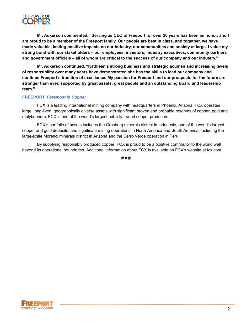 2 Mr. Adkerson commented, “Serving as CEO of Freeport for over 20 years has been an honor, and I am proud to be a member of the Freeport family. Our people are best in class, and together, we have made valuable, lasting positive impacts on our industry, our communities and society at large. I value my strong bond with our stakeholders – our employees, investors, industry executives, community partners and government officials – all of whom are critical to the success of our company and our industry.” Mr. Adkerson continued, “Kathleen’s strong business and strategic acumen and increasing levels of responsibility over many years have demonstrated she has the skills to lead our company and continue Freeport’s tradition of excellence. My passion for Freeport and our prospects for the future are stronger than ever, supported by great assets, great people and an outstanding Board and leadership team.” FREEPORT: Foremost in Copper FCX is a leading international mining company with headquarters in Phoenix, Arizona. FCX operates large, long-lived, geographically diverse assets with significant proven and probable reserves of copper, gold and molybdenum. FCX is one of the world’s largest publicly traded copper producers. FCX’s portfolio of assets includes the Grasberg minerals district in Indonesia, one of the world’s largest copper and gold deposits; and significant mining operations in North America and South America, including the large-scale Morenci minerals district in Arizona and the Cerro Verde operation in Peru. By supplying responsibly produced copper, FCX is proud to be a positive contributor to the world well beyond its operational boundaries. Additional information about FCX is available on FCX's website at fcx.com. # # #