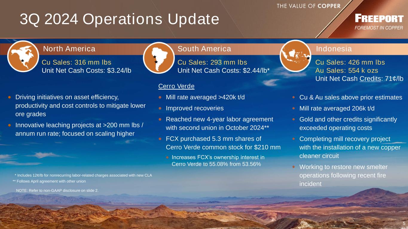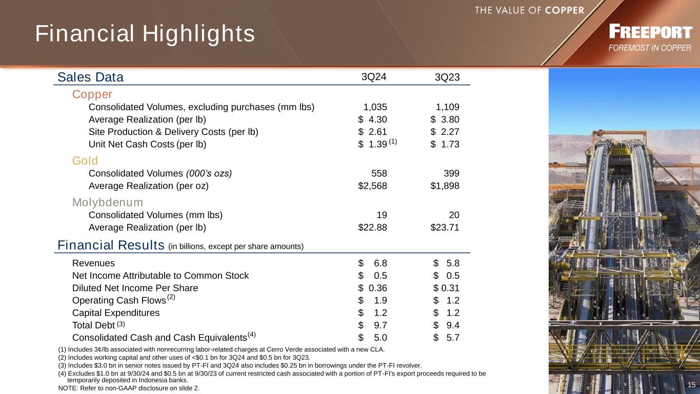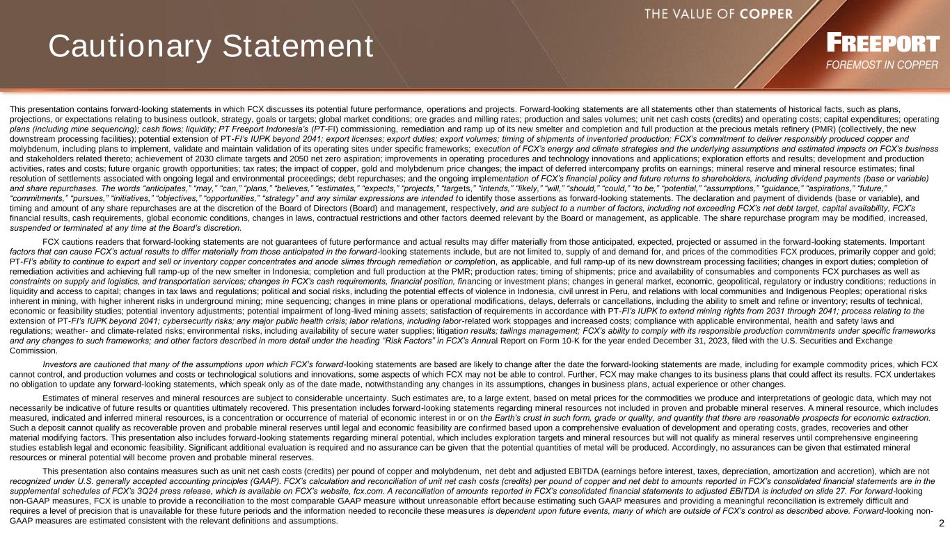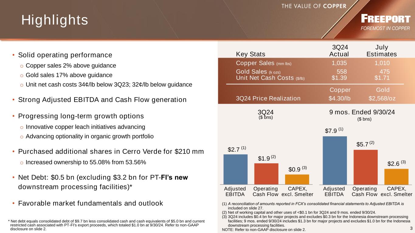 2 This presentation contains forward-looking statements in which FCX discusses its potential future performance, operations and projects. Forward-looking statements are all statements other than statements of historical facts, such as plans, projections, or expectations relating to business outlook, strategy, goals or targets; global market conditions; ore grades and milling rates; production and sales volumes; unit net cash costs (credits) and operating costs; capital expenditures; operating plans (including mine sequencing); cash flows; liquidity; PT Freeport Indonesia’s (PT-FI) commissioning, remediation and ramp up of its new smelter and completion and full production at the precious metals refinery (PMR) (collectively, the new downstream processing facilities); potential extension of PT-FI’s IUPK beyond 2041; export licenses; export duties; export volumes; timing of shipments of inventoried production; FCX’s commitment to deliver responsibly produced copper and molybdenum, including plans to implement, validate and maintain validation of its operating sites under specific frameworks; execution of FCX’s energy and climate strategies and the underlying assumptions and estimated impacts on FCX’s business and stakeholders related thereto; achievement of 2030 climate targets and 2050 net zero aspiration; improvements in operating procedures and technology innovations and applications; exploration efforts and results; development and production activities, rates and costs; future organic growth opportunities; tax rates; the impact of copper, gold and molybdenum price changes; the impact of deferred intercompany profits on earnings; mineral reserve and mineral resource estimates; final resolution of settlements associated with ongoing legal and environmental proceedings; debt repurchases; and the ongoing implementation of FCX’s financial policy and future returns to shareholders, including dividend payments (base or variable) and share repurchases. The words “anticipates,” “may,” “can,” “plans,” “believes,” “estimates,” “expects,” “projects,” “targets,” “intends,” “likely,” “will,” “should,” “could,” “to be,” “potential,” “assumptions,” “guidance,” “aspirations,” “future,” “commitments,” “pursues,” “initiatives,” “objectives,” “opportunities,” “strategy” and any similar expressions are intended to identify those assertions as forward-looking statements. The declaration and payment of dividends (base or variable), and timing and amount of any share repurchases are at the discretion of the Board of Directors (Board) and management, respectively, and are subject to a number of factors, including not exceeding FCX’s net debt target, capital availability, FCX’s financial results, cash requirements, global economic conditions, changes in laws, contractual restrictions and other factors deemed relevant by the Board or management, as applicable. The share repurchase program may be modified, increased, suspended or terminated at any time at the Board’s discretion. FCX cautions readers that forward-looking statements are not guarantees of future performance and actual results may differ materially from those anticipated, expected, projected or assumed in the forward-looking statements. Important factors that can cause FCX’s actual results to differ materially from those anticipated in the forward-looking statements include, but are not limited to, supply of and demand for, and prices of the commodities FCX produces, primarily copper and gold; PT-FI’s ability to continue to export and sell or inventory copper concentrates and anode slimes through remediation or completion, as applicable, and full ramp-up of its new downstream processing facilities; changes in export duties; completion of remediation activities and achieving full ramp-up of the new smelter in Indonesia; completion and full production at the PMR; production rates; timing of shipments; price and availability of consumables and components FCX purchases as well as constraints on supply and logistics, and transportation services; changes in FCX’s cash requirements, financial position, financing or investment plans; changes in general market, economic, geopolitical, regulatory or industry conditions; reductions in liquidity and access to capital; changes in tax laws and regulations; political and social risks, including the potential effects of violence in Indonesia, civil unrest in Peru, and relations with local communities and Indigenous Peoples; operational risks inherent in mining, with higher inherent risks in underground mining; mine sequencing; changes in mine plans or operational modifications, delays, deferrals or cancellations, including the ability to smelt and refine or inventory; results of technical, economic or feasibility studies; potential inventory adjustments; potential impairment of long-lived mining assets; satisfaction of requirements in accordance with PT-FI’s IUPK to extend mining rights from 2031 through 2041; process relating to the extension of PT-FI’s IUPK beyond 2041; cybersecurity risks; any major public health crisis; labor relations, including labor-related work stoppages and increased costs; compliance with applicable environmental, health and safety laws and regulations; weather- and climate-related risks; environmental risks, including availability of secure water supplies; litigation results; tailings management; FCX’s ability to comply with its responsible production commitments under specific frameworks and any changes to such frameworks; and other factors described in more detail under the heading “Risk Factors” in FCX’s Annual Report on Form 10-K for the year ended December 31, 2023, filed with the U.S. Securities and Exchange Commission. Investors are cautioned that many of the assumptions upon which FCX’s forward-looking statements are based are likely to chan