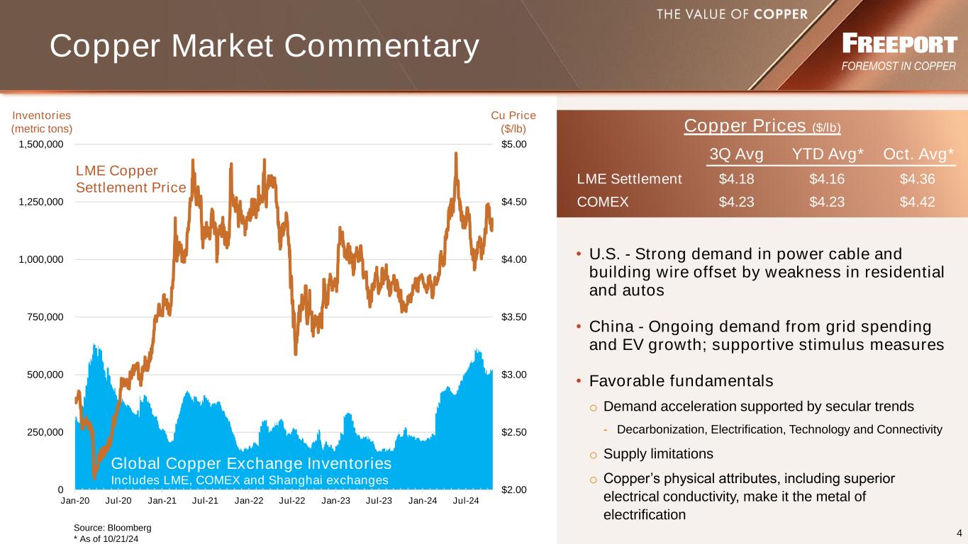 3 Highlights • Solid operating performance o Copper sales 2% above guidance o Gold sales 17% above guidance o Unit net cash costs 34¢/lb below 3Q23; 32¢/lb below guidance • Strong Adjusted EBITDA and Cash Flow generation • Progressing long-term growth options o Innovative copper leach initiatives advancing o Advancing optionality in organic growth portfolio • Purchased additional shares in Cerro Verde for $210 mm o Increased ownership to 55.08% from 53.56% • Net Debt: $0.5 bn (excluding $3.2 bn for PT-FI’s new downstream processing facilities)* • Favorable market fundamentals and outlook 3Q24 July Key Stats Actual Estimates Copper Sales (mm lbs) 1,035 1,010 Gold Sales (k ozs) 558 475 Unit Net Cash Costs ($/lb) $1.39 $1.71 Copper Gold 3Q24 Price Realization $4.30/lb $2,568/oz Operating Cash Flow CAPEX, excl. Smelter $2.6 (3) $5.7 (2) 9 mos. Ended 9/30/24 ($ bns) (1) A reconciliation of amounts reported in FCX’s consolidated financial statements to Adjusted EBITDA is included on slide 27. (2) Net of working capital and other uses of <$0.1 bn for 3Q24 and 9 mos. ended 9/30/24. (3) 3Q24 includes $0.4 bn for major projects and excludes $0.3 bn for the Indonesia downstream processing facilities; 9 mos. ended 9/30/24 includes $1.3 bn for major projects and excludes $1.0 bn for the Indonesia downstream processing facilities. NOTE: Refer to non-GAAP disclosure on slide 2. $7.9 (1) Adjusted EBITDA $0.9 (3) $1.9 (2) 3Q24 ($ bns) $2.7 (1) Operating Cash Flow CAPEX, excl. Smelter Adjusted EBITDA * Net debt equals consolidated debt of $9.7 bn less consolidated cash and cash equivalents of $5.0 bn and current restricted cash associated with PT-FI's export proceeds, which totaled $1.0 bn at 9/30/24. Refer to non-GAAP disclosure on slide 2.