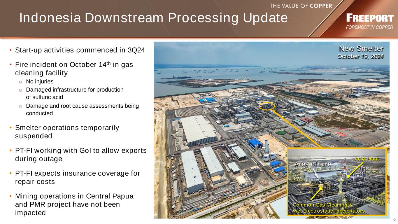 5 3Q 2024 Operations Update North America South America Indonesia Cu Sales: 316 mm lbs Unit Net Cash Costs: $3.24/lb Cu Sales: 293 mm lbs Unit Net Cash Costs: $2.44/lb* Cu Sales: 426 mm lbs Au Sales: 554 k ozs Unit Net Cash Credits: 71¢/lb 5 • Driving initiatives on asset efficiency, productivity and cost controls to mitigate lower ore grades • Innovative leaching projects at >200 mm lbs / annum run rate; focused on scaling higher Cerro Verde • Mill rate averaged >420k t/d • Improved recoveries • Reached new 4-year labor agreement with second union in October 2024** • FCX purchased 5.3 mm shares of Cerro Verde common stock for $210 mm • Increases FCX’s ownership interest in Cerro Verde to 55.08% from 53.56% • Cu & Au sales above prior estimates • Mill rate averaged 206k t/d • Gold and other credits significantly exceeded operating costs • Completing mill recovery project with the installation of a new copper cleaner circuit • Working to restore new smelter operations following recent fire incident NOTE: Refer to non-GAAP disclosure on slide 2. * Includes 12¢/lb for nonrecurring labor-related charges associated with new CLA ** Follows April agreement with other union