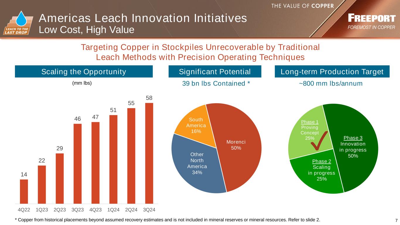 6 Indonesia Downstream Processing Update • Start-up activities commenced in 3Q24 • Fire incident on October 14th in gas cleaning facility o No injuries o Damaged infrastructure for production of sulfuric acid o Damage and root cause assessments being conducted • Smelter operations temporarily suspended • PT-FI working with GoI to allow exports during outage • PT-FI expects insurance coverage for repair costs • Mining operations in Central Papua and PMR project have not been impacted New Smelter October 19, 2024 Acid Plant Common Gas Cleaning & Wet Electrostatic Precipitators Area of Fire