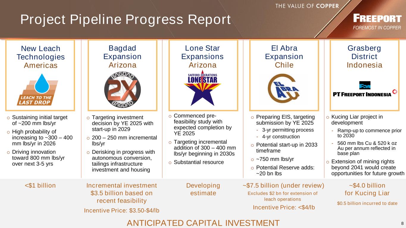7 Americas Leach Innovation Initiatives Low Cost, High Value South America 16% Other North America 34% Morenci 50% Targeting Copper in Stockpiles Unrecoverable by Traditional Leach Methods with Precision Operating Techniques * Copper from historical placements beyond assumed recovery estimates and is not included in mineral reserves or mineral resources. Refer to slide 2. Significant Potential Phase 1 Proving Concept 25% Phase 2 Scaling in progress 25% Phase 3 Innovation in progress 50% 39 bn lbs Contained * ~800 mm lbs/annum 14 22 29 46 47 51 55 58 4Q22 1Q23 2Q23 3Q23 4Q23 1Q24 2Q24 3Q24 Scaling the Opportunity (mm lbs) Long-term Production Target ✓