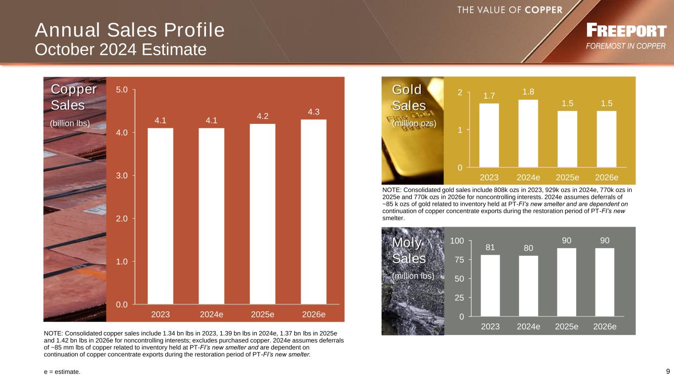 8 New Leach Technologies Americas Bagdad Expansion Arizona Grasberg District Indonesia El Abra Expansion Chile Lone Star Expansions Arizona Project Pipeline Progress Report o Sustaining initial target of ~200 mm lbs/yr o High probability of increasing to ~300 – 400 mm lbs/yr in 2026 o Driving innovation toward 800 mm lbs/yr over next 3-5 yrs o Targeting investment decision by YE 2025 with start-up in 2029 o 200 – 250 mm incremental lbs/yr o Derisking in progress with autonomous conversion, tailings infrastructure investment and housing o Commenced pre- feasibility study with expected completion by YE 2025 o Targeting incremental addition of 300 – 400 mm lbs/yr beginning in 2030s o Substantial resource o Kucing Liar project in development - Ramp-up to commence prior to 2030 - 560 mm lbs Cu & 520 k oz Au per annum reflected in base plan o Extension of mining rights beyond 2041 would create opportunities for future growth o Preparing EIS, targeting submission by YE 2025 - 3-yr permitting process - 4-yr construction o Potential start-up in 2033 timeframe o ~750 mm lbs/yr o Potential Reserve adds: ~20 bn lbs ANTICIPATED CAPITAL INVESTMENT <$1 billion Incremental investment $3.5 billion based on recent feasibility Incentive Price: $3.50-$4/lb Developing estimate ~$7.5 billion (under review) ~$4.0 billion for Kucing Liar $0.5 billion incurred to date Excludes $2 bn for extension of leach operations Incentive Price: <$4/lb