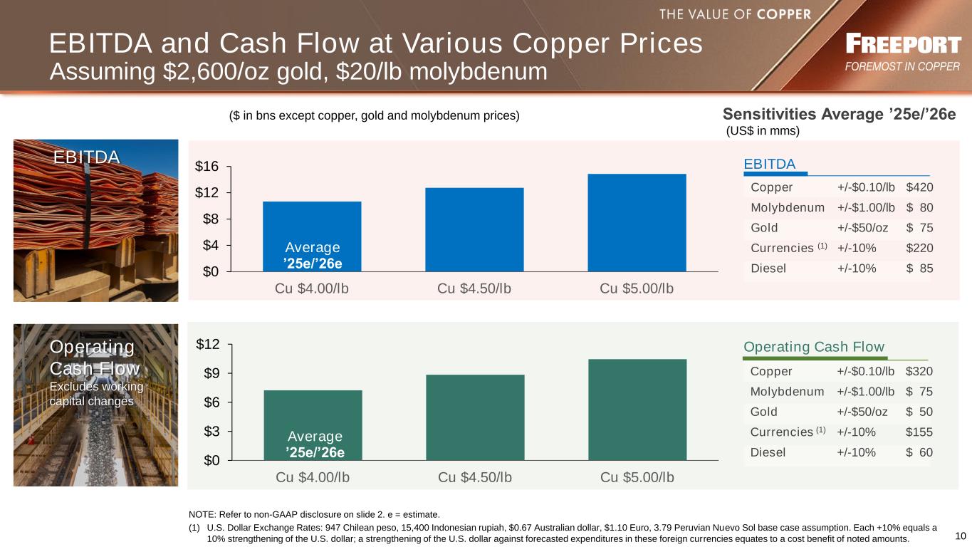 9 Annual Sales Profile NOTE: Consolidated copper sales include 1.34 bn lbs in 2023, 1.39 bn lbs in 2024e, 1.37 bn lbs in 2025e and 1.42 bn lbs in 2026e for noncontrolling interests; excludes purchased copper. 2024e assumes deferrals of ~85 mm lbs of copper related to inventory held at PT-FI’s new smelter and are dependent on continuation of copper concentrate exports during the restoration period of PT-FI’s new smelter. 0.0 1.0 2.0 3.0 4.0 5.0 2023 2024e 2025e 2026e 4.1 4.1 4.2 4.3 0 1 2 2023 2024e 2025e 2026e 1.7 1.5 1.5 0 25 50 75 100 2023 2024e 2025e 2026e 81 80 90 90 e = estimate. NOTE: Consolidated gold sales include 808k ozs in 2023, 929k ozs in 2024e, 770k ozs in 2025e and 770k ozs in 2026e for noncontrolling interests. 2024e assumes deferrals of ~85 k ozs of gold related to inventory held at PT-FI’s new smelter and are dependent on continuation of copper concentrate exports during the restoration period of PT-FI’s new smelter. (billion lbs) Copper Sales (million lbs) Moly Sales Gold Sales (million ozs) October 2024 Estimate 1.8