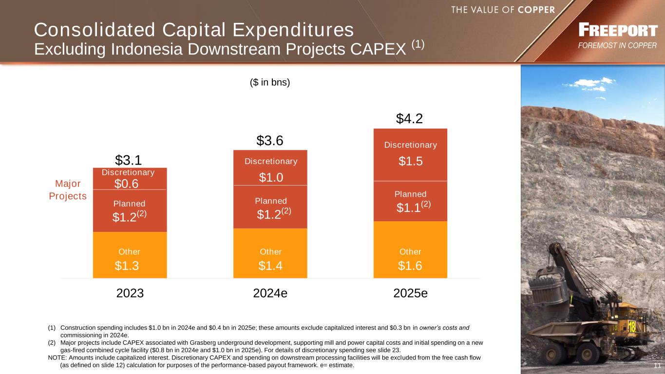 10 NOTE: Refer to non-GAAP disclosure on slide 2. e = estimate. (1) U.S. Dollar Exchange Rates: 947 Chilean peso, 15,400 Indonesian rupiah, $0.67 Australian dollar, $1.10 Euro, 3.79 Peruvian Nuevo Sol base case assumption. Each +10% equals a 10% strengthening of the U.S. dollar; a strengthening of the U.S. dollar against forecasted expenditures in these foreign currencies equates to a cost benefit of noted amounts. $0 $4 $8 $12 $16 Cu $4.00/lb Cu $4.50/lb Cu $5.00/lb Average ’25e/’26e $0 $3 $6 $9 $12 Cu $4.00/lb Cu $4.50/lb Cu $5.00/lb Average ’25e/’26e ($ in bns except copper, gold and molybdenum prices) Operating Cash Flow Excludes working capital changes EBITDA EBITDA and Cash Flow at Various Copper Prices Sensitivities Average ’25e/’26e (US$ in mms) EBITDA Operating Cash Flow Copper +/-$0.10/lb $320 Molybdenum +/-$1.00/lb $ 75 Gold +/-$50/oz $ 50 Currencies (1) +/-10% $155 Diesel +/-10% $ 60 Copper +/-$0.10/lb $420 Molybdenum +/-$1.00/lb $ 80 Gold +/-$50/oz $ 75 Currencies (1) +/-10% $220 Diesel +/-10% $ 85 Assuming $2,600/oz gold, $20/lb molybdenum