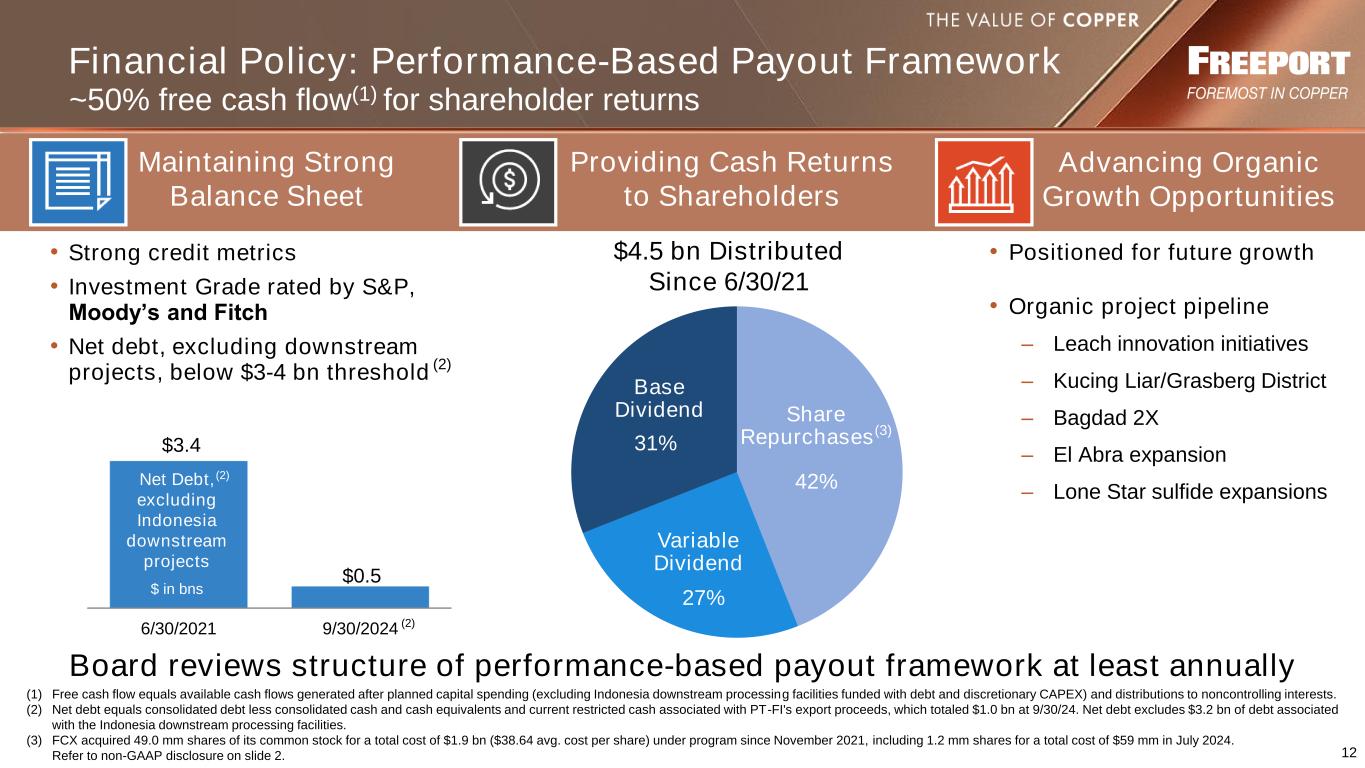 11 2023 2024e 2025e Consolidated Capital Expenditures Major Projects (1) Construction spending includes $1.0 bn in 2024e and $0.4 bn in 2025e; these amounts exclude capitalized interest and $0.3 bn in owner’s costs and commissioning in 2024e. (2) Major projects include CAPEX associated with Grasberg underground development, supporting mill and power capital costs and initial spending on a new gas-fired combined cycle facility ($0.8 bn in 2024e and $1.0 bn in 2025e). For details of discretionary spending see slide 23. NOTE: Amounts include capitalized interest. Discretionary CAPEX and spending on downstream processing facilities will be excluded from the free cash flow (as defined on slide 12) calculation for purposes of the performance-based payout framework. e= estimate. ($ in bns) $1.7(2) $1.2(2) $1.3 $3.1 $1.6 $1.1(2)Planned Discretionary Planned Discretionary $1.5 $0.6 $4.2 Other Other Excluding Indonesia Downstream Projects CAPEX (1) $1.4 $1.2(2) Planned Discretionary $1.0 $3.6 Other