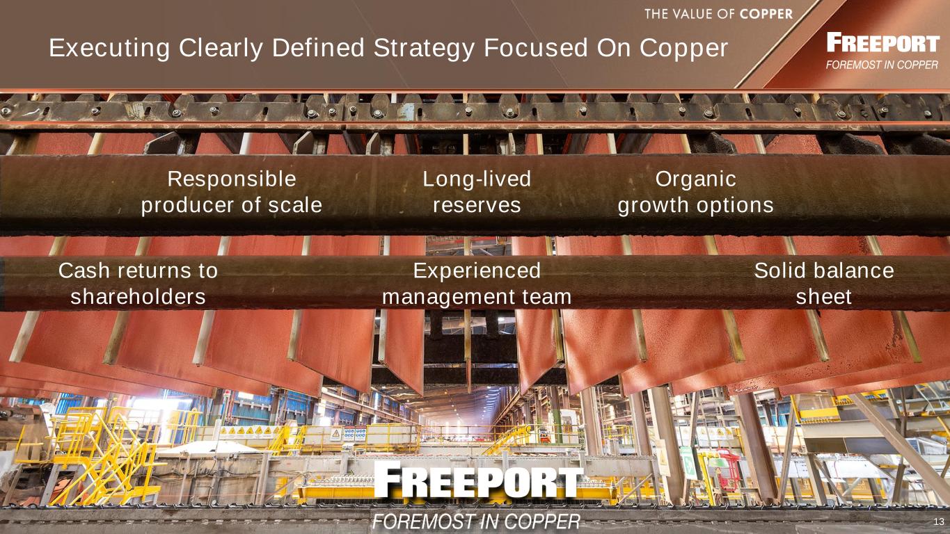 12 Financial Policy: Performance-Based Payout Framework (1) Free cash flow equals available cash flows generated after planned capital spending (excluding Indonesia downstream processing facilities funded with debt and discretionary CAPEX) and distributions to noncontrolling interests. (2) Net debt equals consolidated debt less consolidated cash and cash equivalents and current restricted cash associated with PT-FI's export proceeds, which totaled $1.0 bn at 9/30/24. Net debt excludes $3.2 bn of debt associated with the Indonesia downstream processing facilities. (3) FCX acquired 49.0 mm shares of its common stock for a total cost of $1.9 bn ($38.64 avg. cost per share) under program since November 2021, including 1.2 mm shares for a total cost of $59 mm in July 2024. Refer to non-GAAP disclosure on slide 2. Board reviews structure of performance-based payout framework at least annually Maintaining Strong Balance Sheet 6/30/2021 9/30/2024 $0.5 $3.4 (2) Net Debt, excluding Indonesia downstream projects $ in bns Providing Cash Returns to Shareholders $4.5 bn Distributed Since 6/30/21 42% Share Repurchases(3) Variable Dividend Base Dividend 31% 27% Advancing Organic Growth Opportunities • Positioned for future growth • Organic project pipeline – Leach innovation initiatives – Kucing Liar/Grasberg District – Bagdad 2X – El Abra expansion – Lone Star sulfide expansions (2) (2) • Strong credit metrics • Investment Grade rated by S&P, Moody’s and Fitch • Net debt, excluding downstream projects, below $3-4 bn threshold ~50% free cash flow(1) for shareholder returns